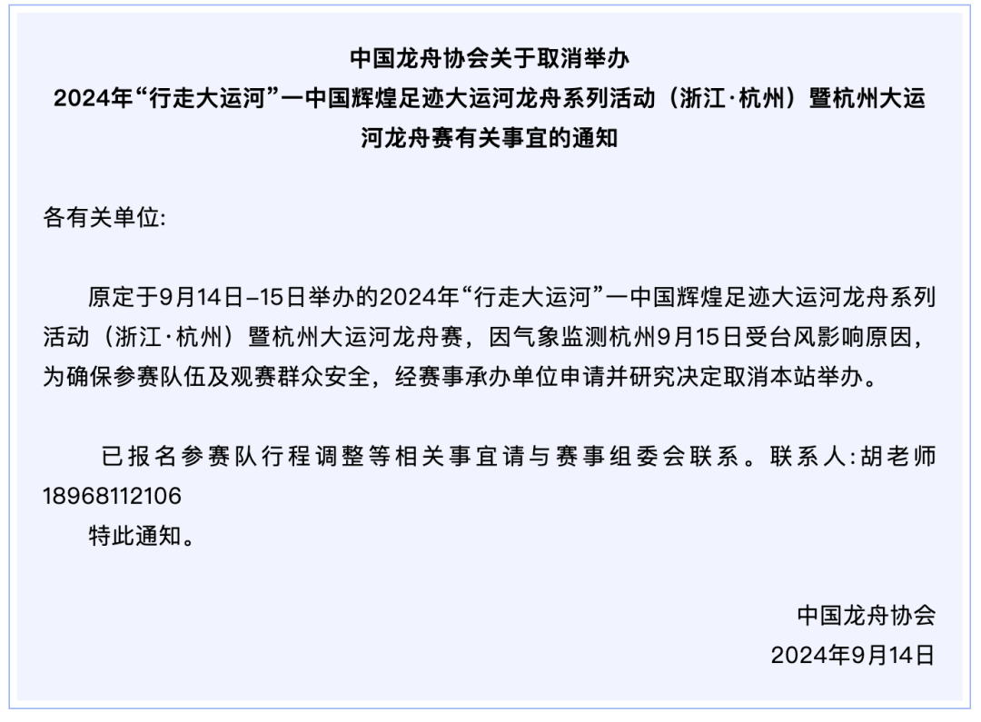 原定于9月14日-15日举办的2024年“行走大运河”一中国辉煌足迹大运河龙舟系列活动(浙江·杭州)暨杭州大运河龙舟赛,受台风影响原因,决定取消本站举办。