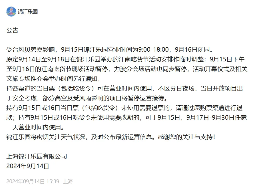 上海锦江乐园官微消息,受台风贝碧嘉影响,9月15日锦江乐园营业时间为9:00-18:00,9月16日闭园。原定9月14日至9月18日在锦江乐园举办的江南吃货节活动安排作临时调整:9月15日下午至9月16日的江南吃货节现场活动暂停,力波分会场活动也同步暂停,活动开幕仪式及相关文旅专场推介会举办时间另行通知。