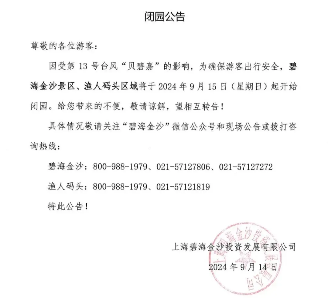 上海奉贤碧海金沙景区官微消息,因受13号台风“贝碧嘉”的影响,为确保游客出行安全,碧海金沙景区、渔人码头区域将于2024年9月15日(星期日)起开始闭园。