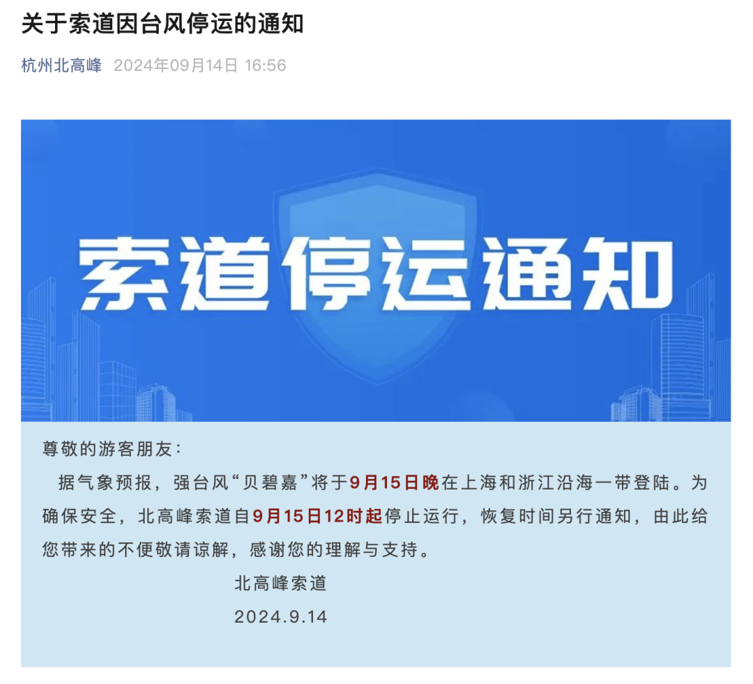9月14日下午,杭州北高峰官方微信发布通告:为确保安全,北高峰索道自9月15日12时起停止运行,恢复时间另行通知。