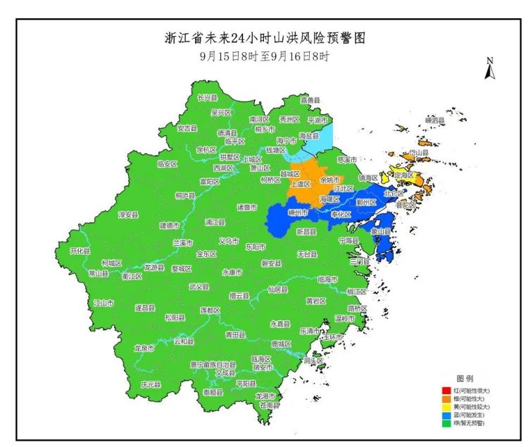 省水利厅、省气象局9月15日7时39分联合发布山洪灾害预警:根据省气象台未来降雨预报,预计9月15日8时至9月16日8时,余姚市、上虞区、普陀区、岱山县发生山洪灾害可能性大(橙色预警),定海区、嵊泗县发生山洪灾害可能性较大(黄色预警),海曙区、北仑区、鄞州区、奉化区、象山县、嵊州市可能发生山洪灾害(蓝色预警)。