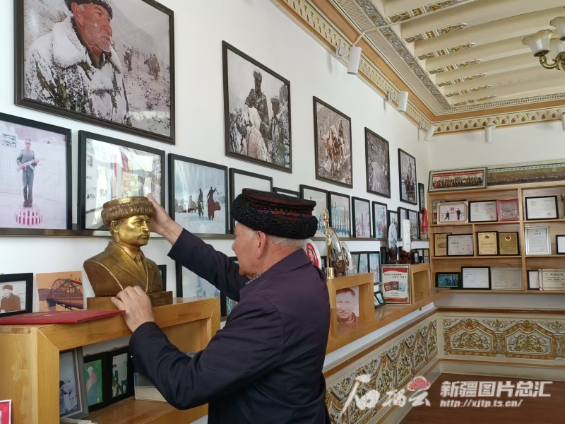 巴依卡家的客厅里,挂满了边防官兵为他拍的照片:冰河里,他骑着牦牛冲在巡逻队伍前面;雪山上,他的胡子和衣帽挂满冰霜;国旗下,他行注目礼深情唱国歌;界碑前,他把“中国”两个字描红。