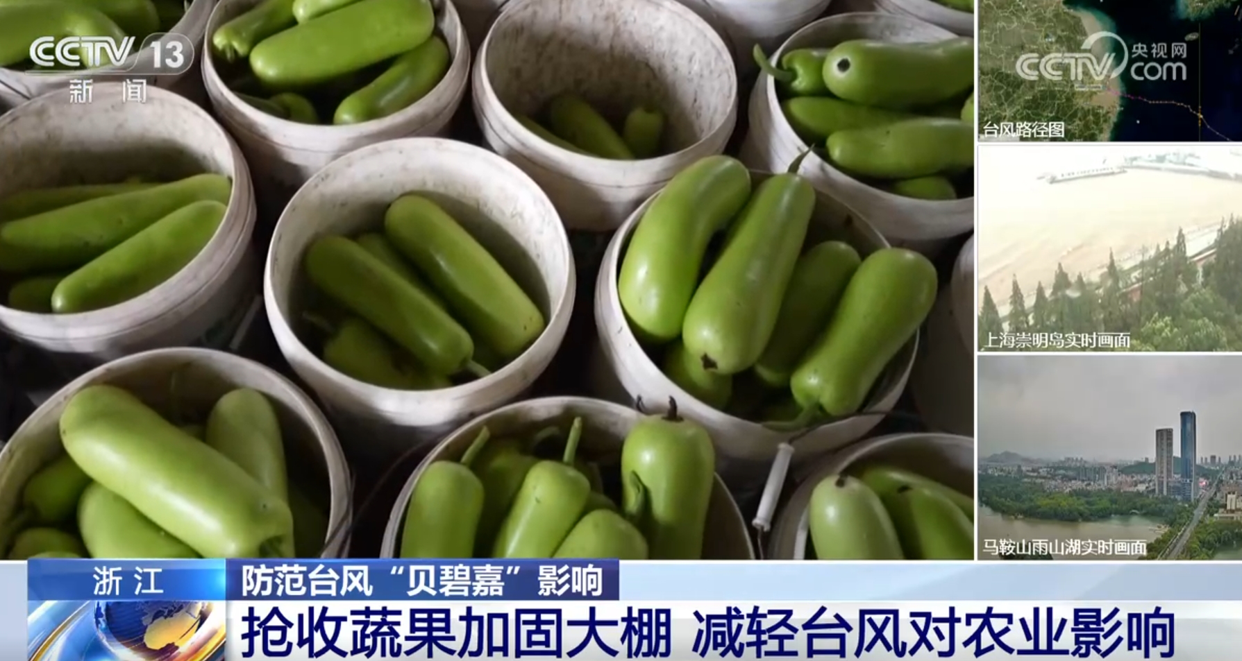 眼下正是秋果成熟时节,为应对台风“贝碧嘉”带来的影响,浙江各地组织人员抢收农作物。在平湖市新仓镇,当地不少果蔬基地地蒲等蔬菜都已成熟,农户们正在抓紧采收。针对易受风雨影响的大棚等农业设施,农户们对其进行了加固,并对排水沟渠进行清理,确保排水通畅。