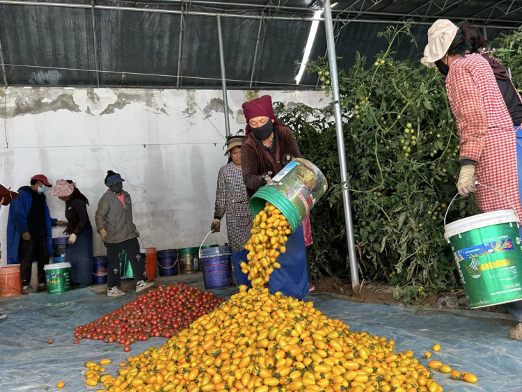 在拉萨市达孜区最偏远的穷达村,当地村民达瓦次仁正在果蔬种植基地麻利地采摘番茄。成熟的果子色彩明媚、圆润饱满,金黄、鲜红、绛紫,很快装满一桶,达瓦次仁赶紧提到果蔬大棚前端的空地上,堆放在一起。