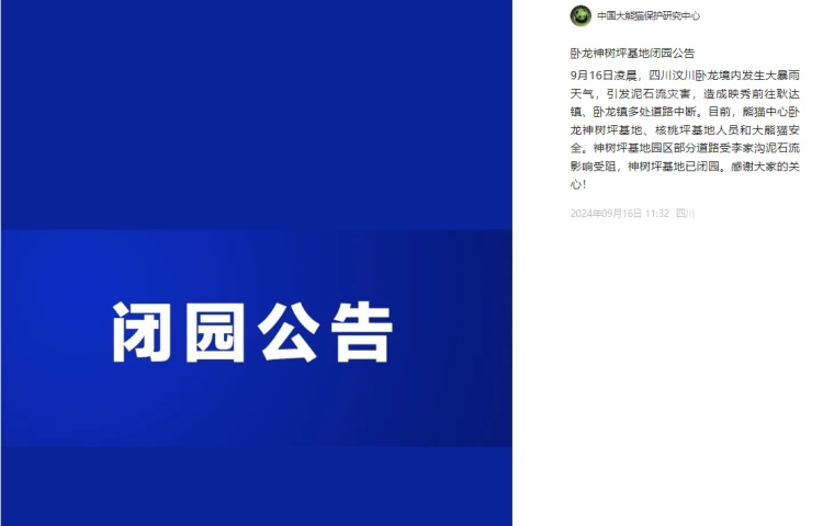 9月16日凌晨,四川汶川卧龙境内发生大暴雨天气,引发泥石流灾害,造成映秀前往耿达镇、卧龙镇多处道路中断。目前,熊猫中心卧龙神树坪基地、核桃坪基地人员和大熊猫安全。神树坪基地园区部分道路受李家沟泥石流影响受阻,神树坪基地已闭园。感谢大家的关心!
