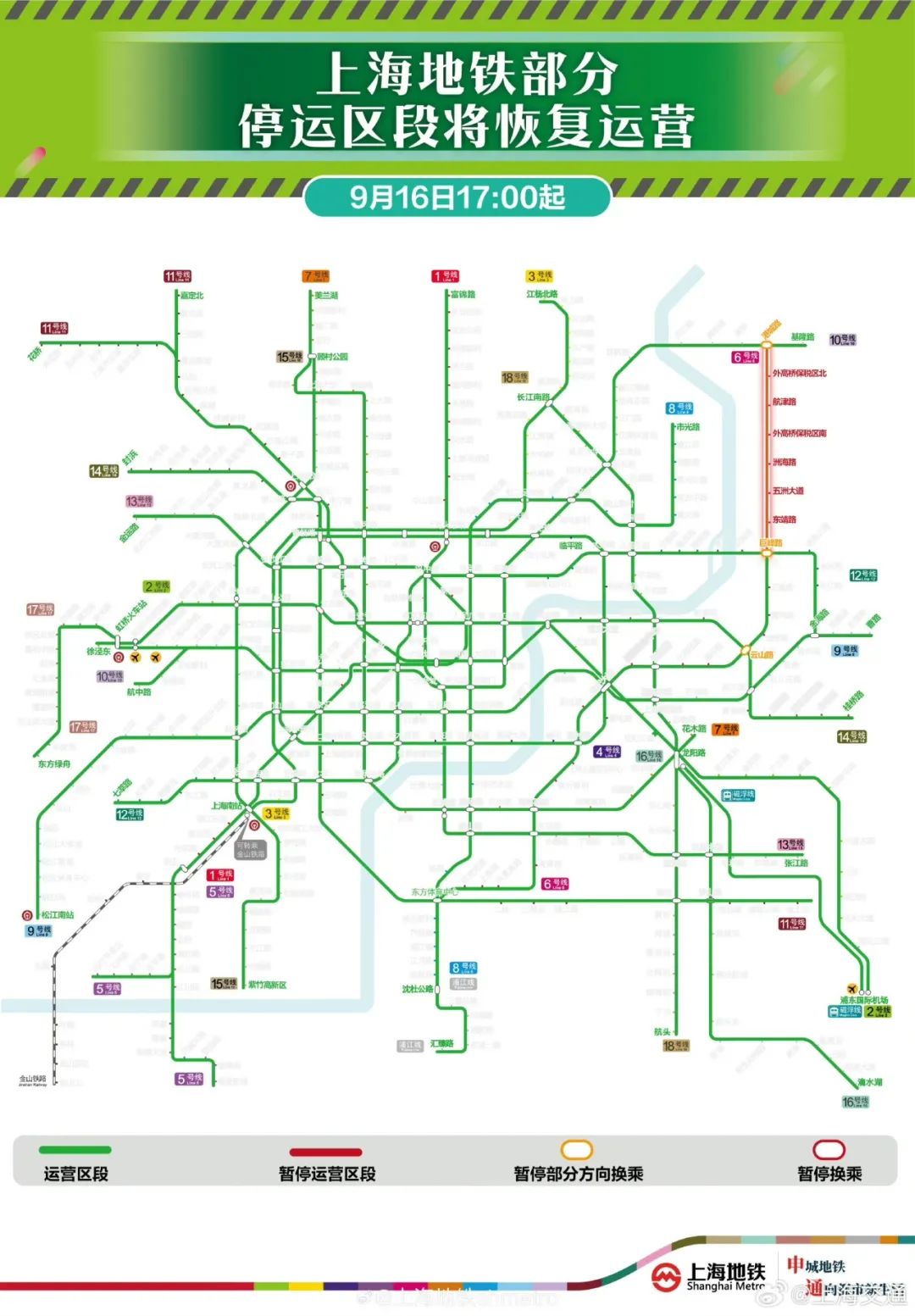 目前,台风“贝碧嘉”风雨影响减弱,6号线巨峰路站至港城路站区段自18时20分起逐步恢复运营。至此,上海地铁全网络所有线路均恢复正常运营。详见↓