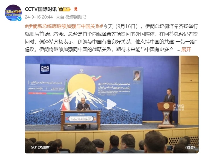 今天(9月16日),伊朗总统佩泽希齐扬举行就职后首场记者会。总台是首个向佩泽希齐扬提问的外国媒体。在回答总台记者提问时,佩泽希齐扬表示,伊朗与中国有着良好关系。他支持中国的共建“一带一路”倡议,伊朗将继续加强同中国的战略关系,期待未来能与中国有更多合作。他强调,两国应继续执行《中伊全面合作计划》。