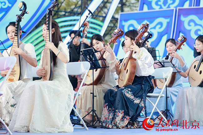 北京乐府民乐团在云浮莲花状的舞台中合奏《卢沟晓月》,与右方长70米、高18米的“卢沟晓月”大型灯组遥相辉映。观众现场沉浸式感受“涧水如练、西山似黛、斜月西沉、月明皎洁”燕京八景——卢沟晓月。