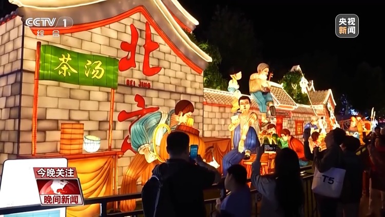 总台记者 李伟:这次京彩灯会,是自贡花灯这项非遗技艺跟北京文化的一次融合和创新。比如这组叫做“北京风物”的彩灯,不仅可以看到像风筝、糖人儿、胡同、二胡这样典型的北京元素,也有新北京的时代风貌。