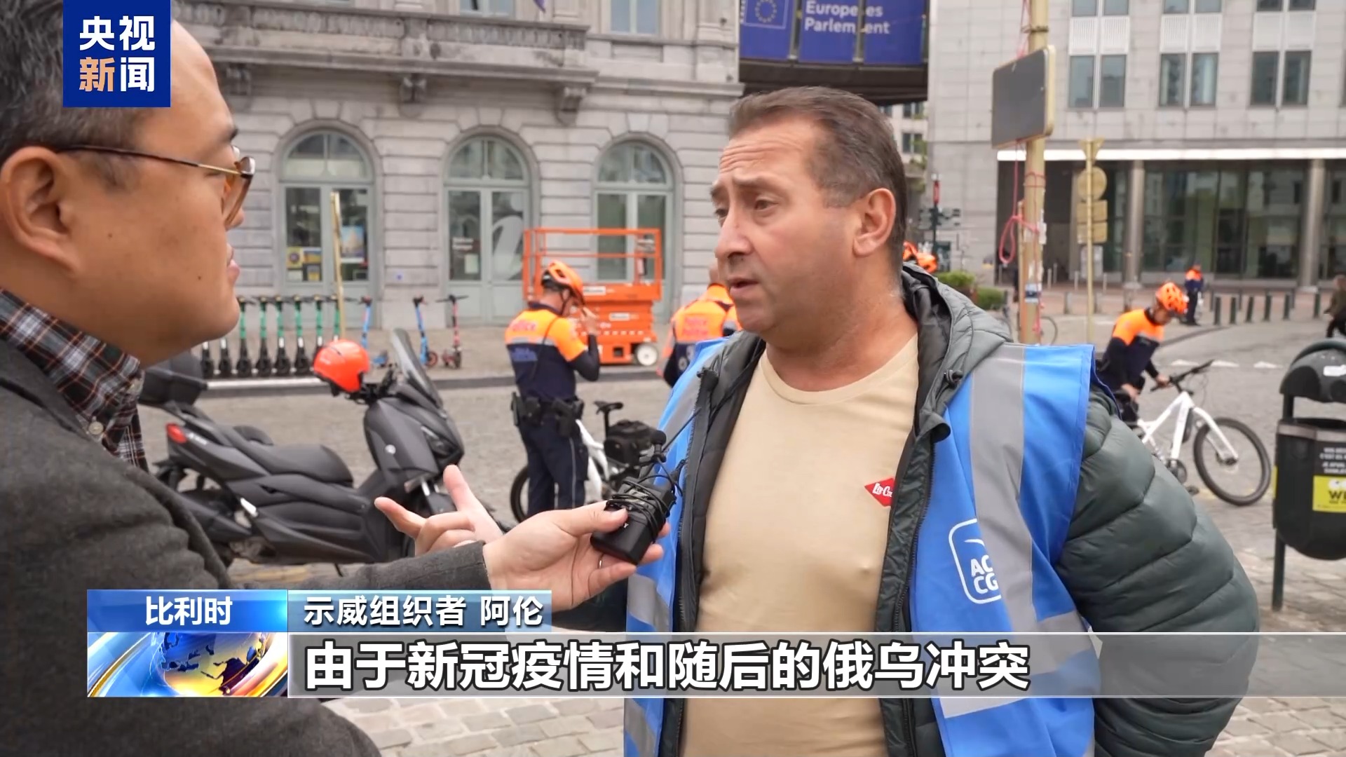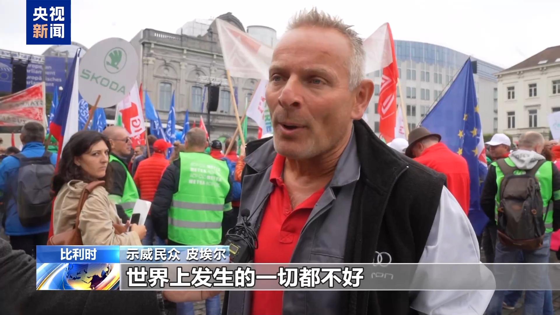 示威组织者 阿伦:由于新冠疫情和随后的俄乌冲突,材料价格上涨,这使得普通工薪阶层,更难负担得起像汽车这样的商品。另外,因为价格上涨,导致需求降低,这是需要考虑的问题,也是我们想传达给欧盟的信息。