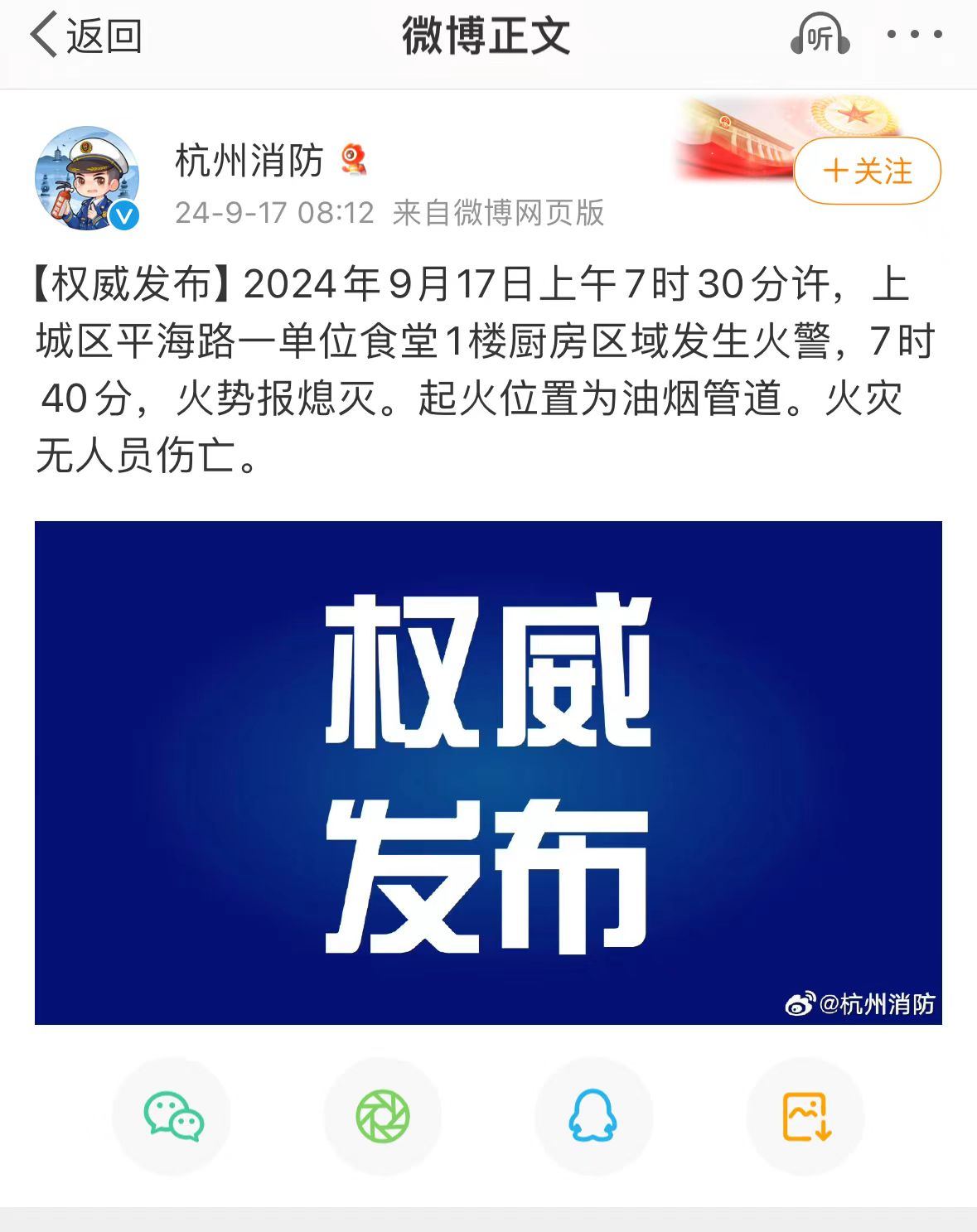 2024年9月17日上午7时30分许,上城区平海路一单位食堂1楼厨房区域发生火警,7时40分,火势报熄灭。起火位置为油烟管道。火灾无人员伤亡。
