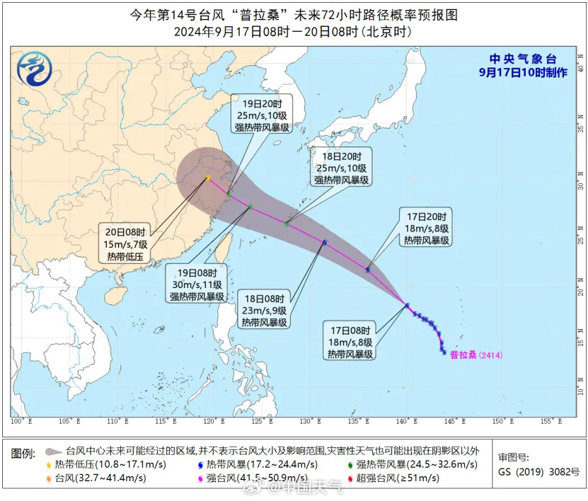中央气象台预计,“普拉桑”将以每小时45—50公里的速度向西北方向快速移动,强度缓慢加强,18日起移速减缓,18日晚上移入东海东部海面,19日下午到晚上将在浙江沿海登陆(强热带风暴级,10—11级,25—30米/秒),之后强度逐渐减弱。