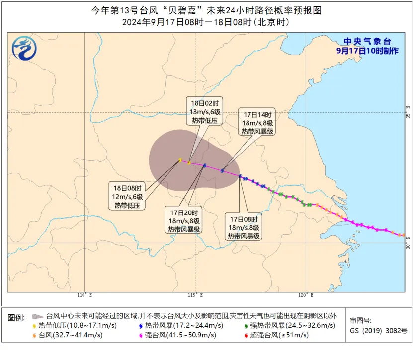 今天(17日)10时,中央气象台继续发布台风蓝色预警:10时,今年第13号台风“贝碧嘉”(热带风暴级)的中心位于安徽省淮南市境内,中心附近最大风力有8级(18米/秒)。预计“贝碧嘉”将以每小时15公里左右的速度向西偏北方向移动,强度继续减弱,将于今天夜间移入河南境内(热带低压,6—7级,12—14米/秒)。