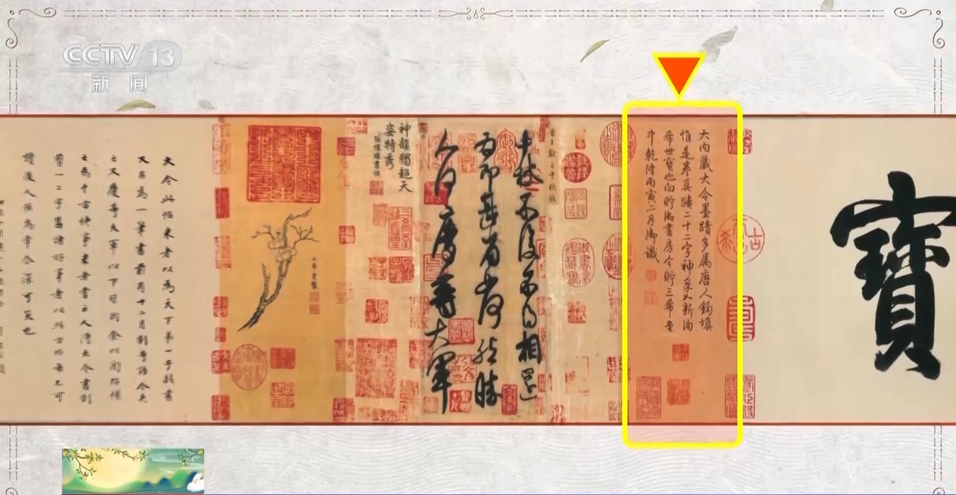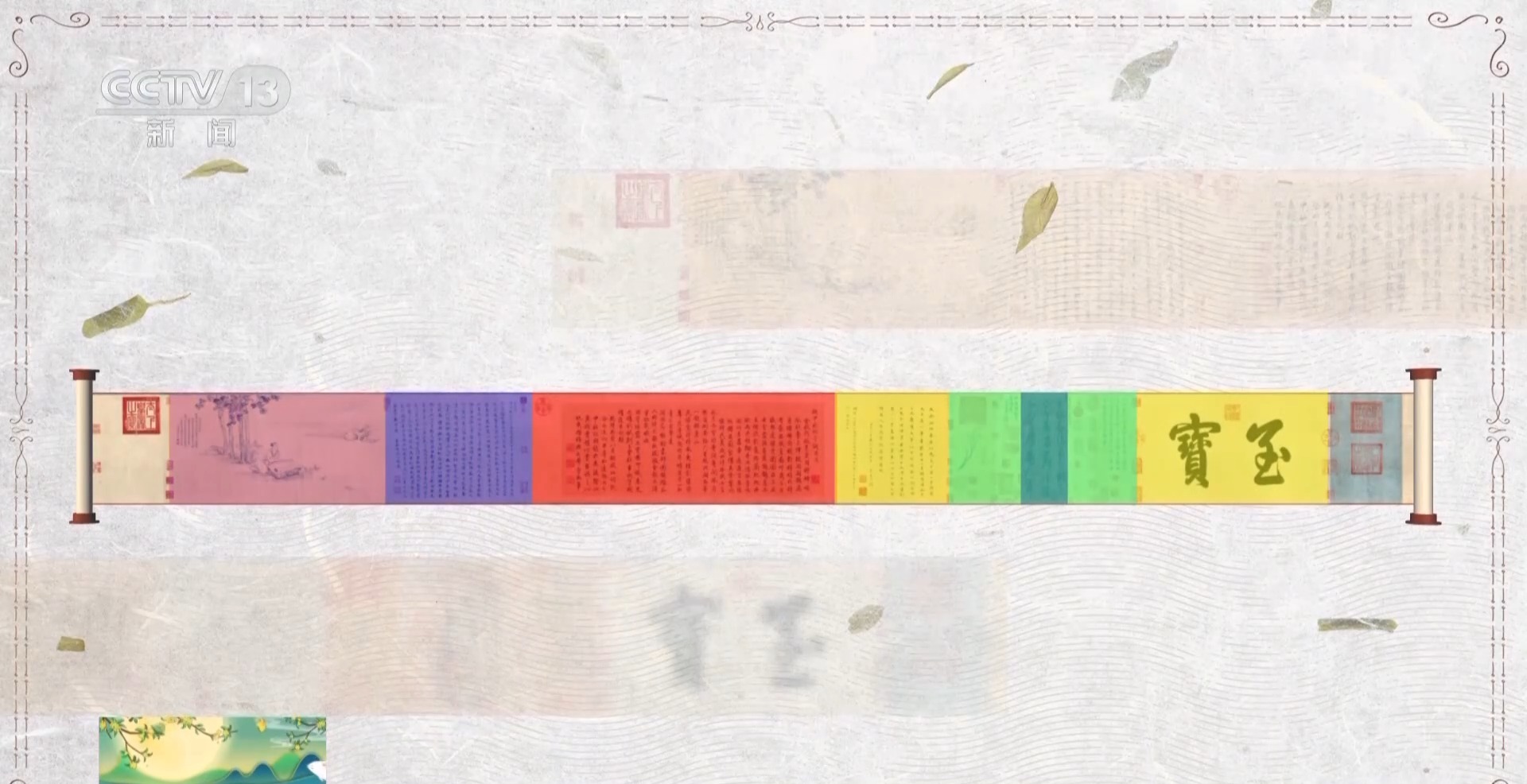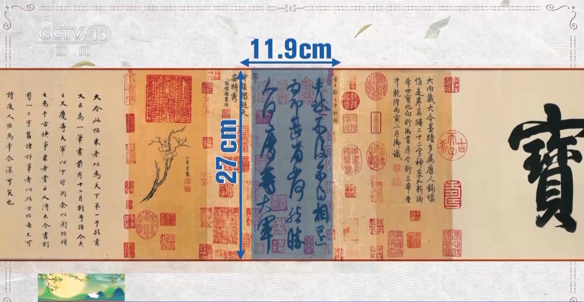 故宫博物院书画部研究馆员 王亦旻:这是中国特有的一种装潢形式,叫“三分创作,七分装裱”,通过装潢形式呈现出它最好的状态。中间这一块是核心的,它的两边是装饰性的隔水,再往外是两个副隔水,今天的这个样子,是清朝乾隆时期完成的装裱样式。