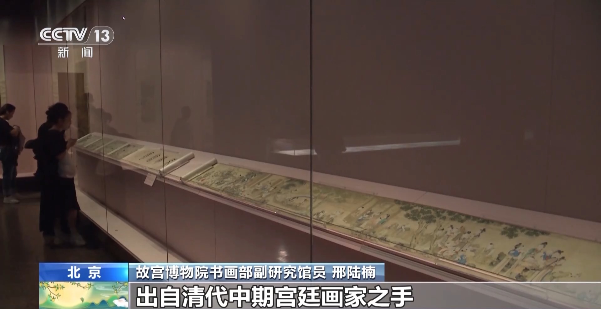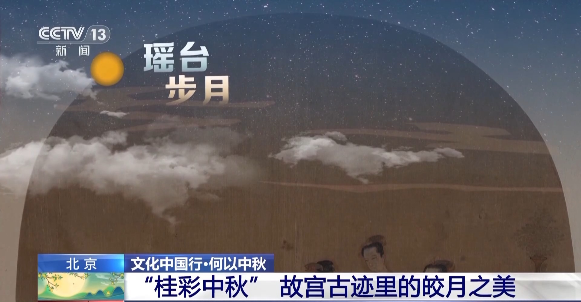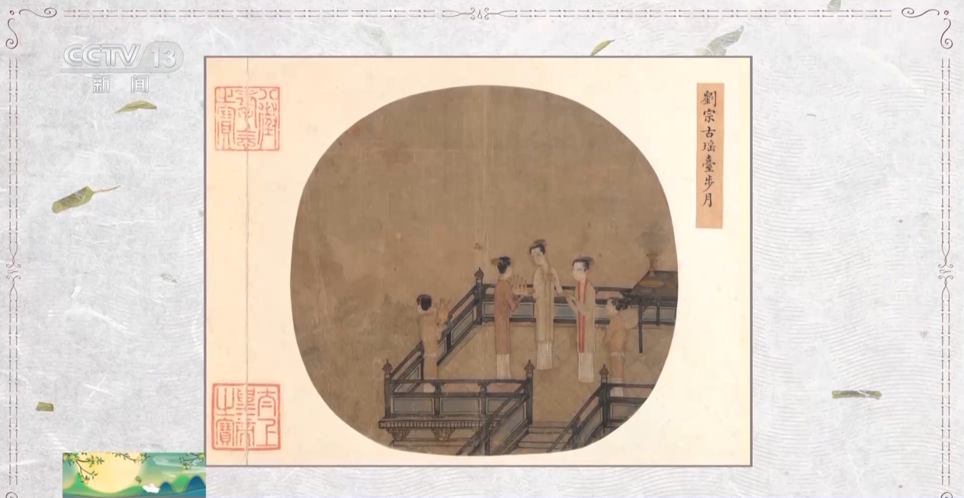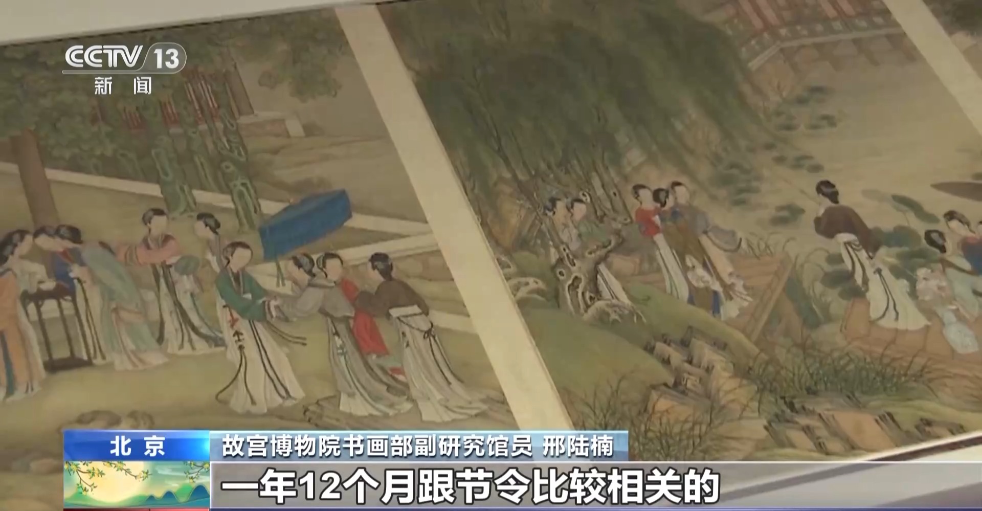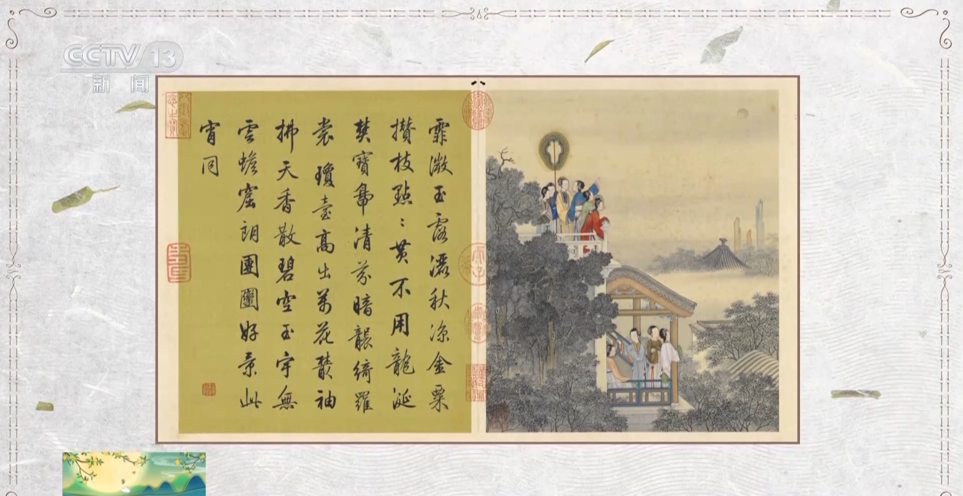 故宫博物院书画部副研究馆员 邢陆楠:它展示的是一年12个月跟节令比较相关的当时宫中女子的一些娱乐活动,第八件表现的就是中秋主题。