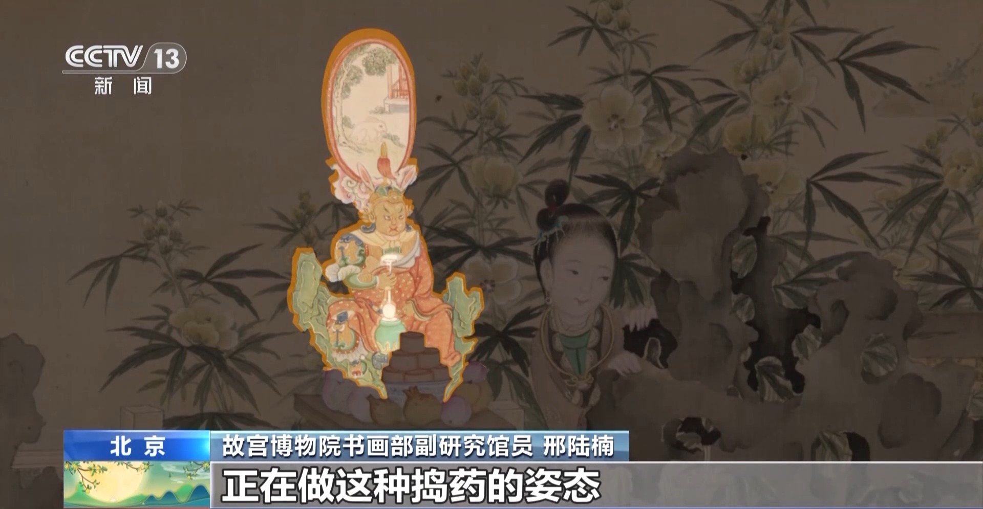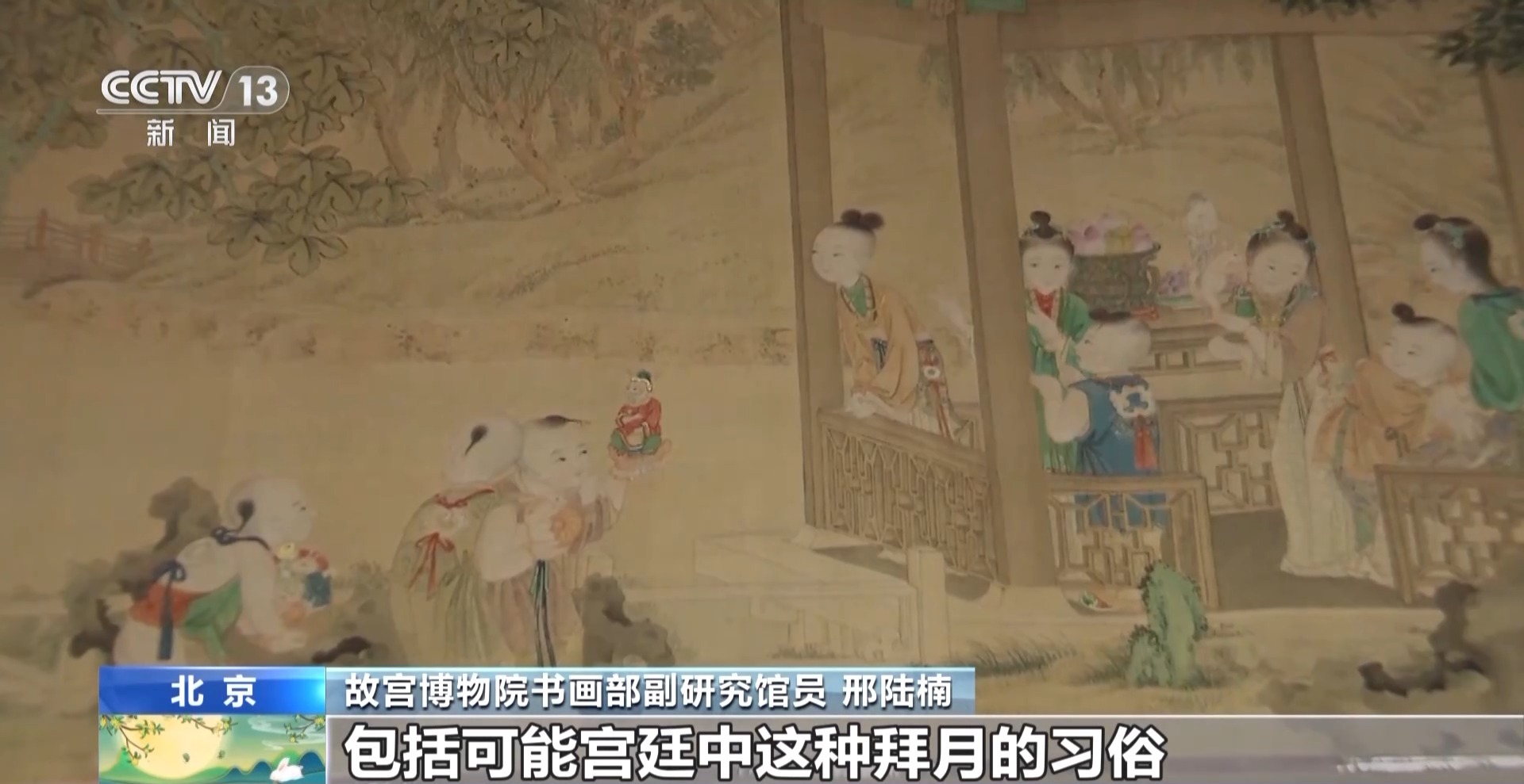 故宫博物院书画部副研究馆员 邢陆楠:画家在绘制的时候其实是非常用心的,他既还原了当时民间包括宫廷中这种拜月的习俗,也加入了很多喜庆、具有美好寓意的元素。