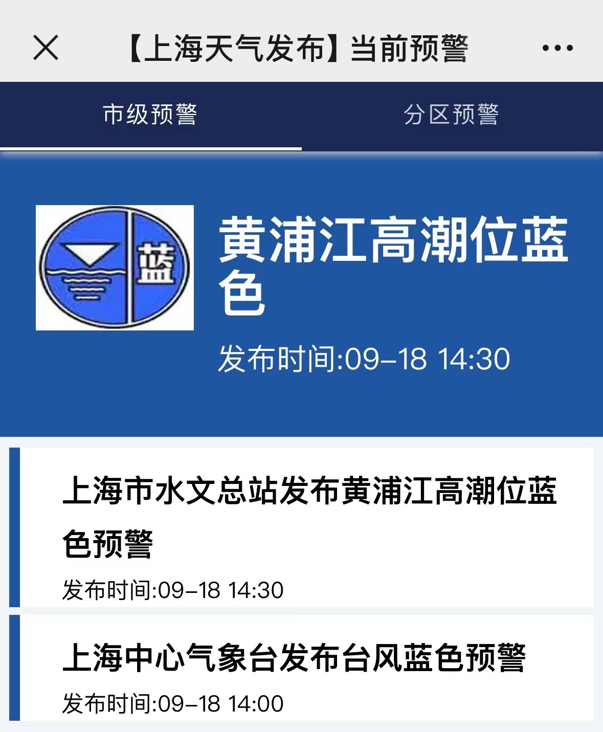上海中心气象台9月18日已发布台风蓝色预警和黄浦江高潮位蓝色预警,再度进入防御模式。