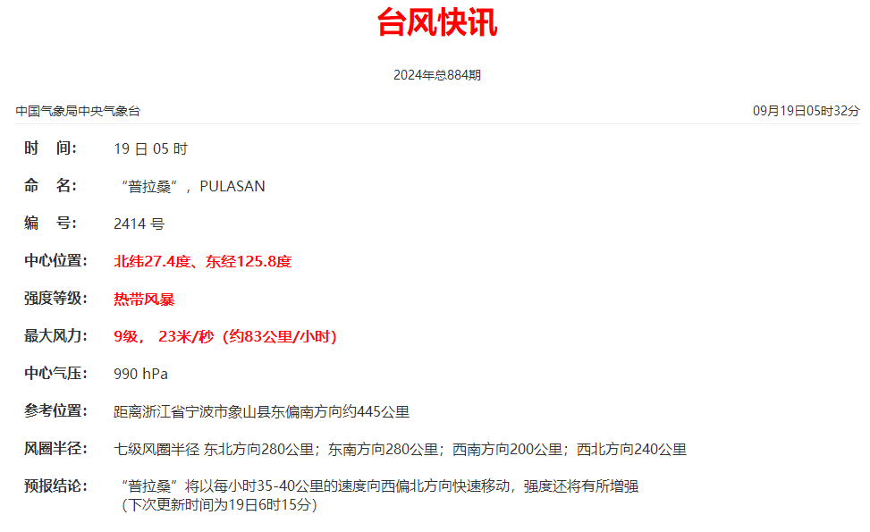 今年第14号台风“普拉桑”(热带风暴级)的中心19日早晨5点钟位于浙江象山县东偏南方向约445公里的东海海面上,就是北纬27.4度、东经125.8度,中心附近最大风力有9级(23米/秒),中心最低气压为990百帕,七级风圈半径200-280公里。