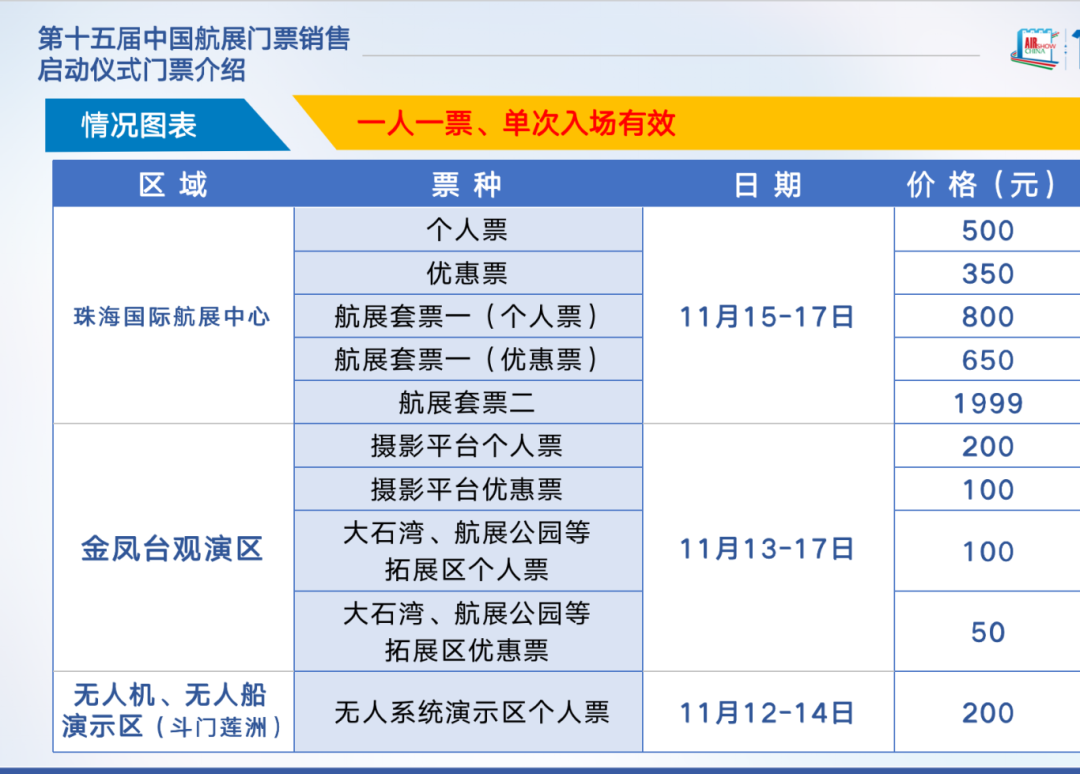 9月19日,第十五届中国国际航空航天博览会(以下简称中国航展)门票正式开售。据了解,本届中国航展门票分为珠海国际航展中心门票、中国航展无人机无人船演示区(斗门莲洲)门票、金凤台观演区门票,三地展演内容不同,门票种类和价格有区别,均不在现场设售票点。所有门票均采用实名制购票。