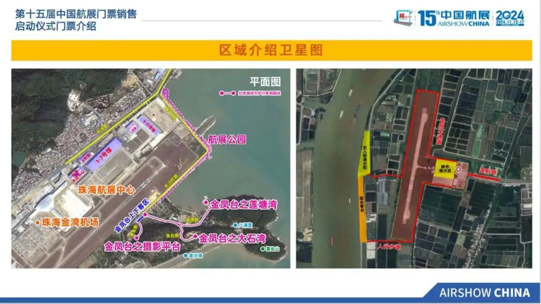 金凤台观演区位于珠海国际航展中心东南方向,包含金凤台之摄影平台、金凤台之大石湾、金凤台之莲塘湾、航展公园四个区域,开放时间为11月13日至17日(11月12日开幕日不开放)。