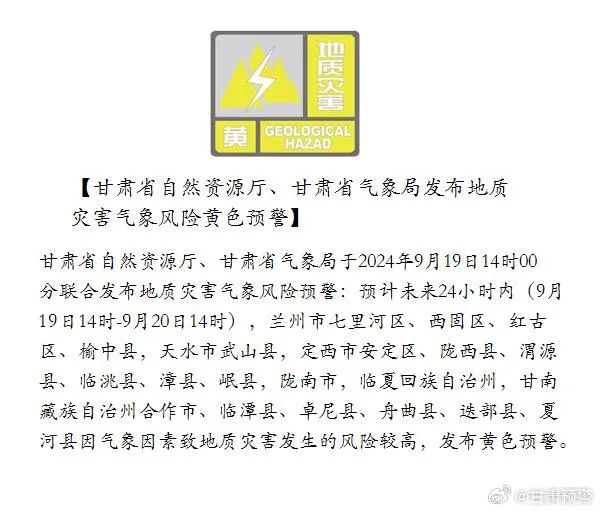 甘肃省自然资源厅、甘肃省气象局于2024年9月19日14时00分联合发布地质灾害气象风险预警:预计未来24小时内(9月19日14时﹣9月20日14时),兰州市七里河区、西固区、红古区、榆中县,天水市武山县,定西市安定区、陇西县、渭源县、临洮县、漳县、岷县,陇南市,临夏回族自治州,甘南藏族自治州合作市、临潭县、卓尼县、舟曲县、迭部县、夏河县因气象因素致地质灾害发生的风险较高,发布黄色预警。