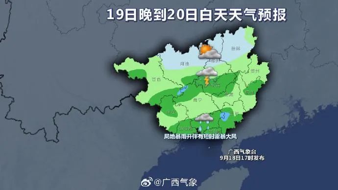 19日晚上到20日白天,百色、崇左、南宁、贵港、玉林、防城港、钦州、北海等市的部分地区有中雨、局地大雨到暴雨并伴有短时雷暴大风等强对流天气,其他地区多云有分散阵雨或雷雨。沿海地区有5~6级、阵风7~8级偏北风。