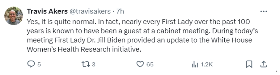 另外,也有网友对此表示,“这很正常。事实上,在过去的 100 年中,几乎每一位第一夫人都曾成为内阁会议的嘉宾。”