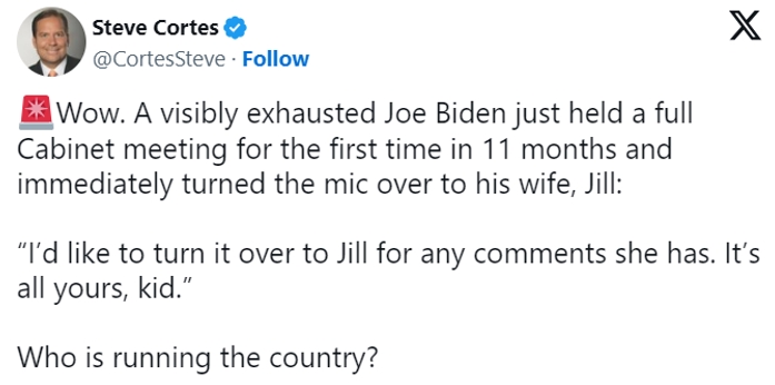 “哇,明显疲惫不堪的拜登刚刚召开了11个月以来的首次全体内阁会议,并立即将麦克风交给了他的妻子吉尔”, 曾经担任前总统特朗普顾问的科尔特斯在社交平台发文说,“谁在管理这个国家?”