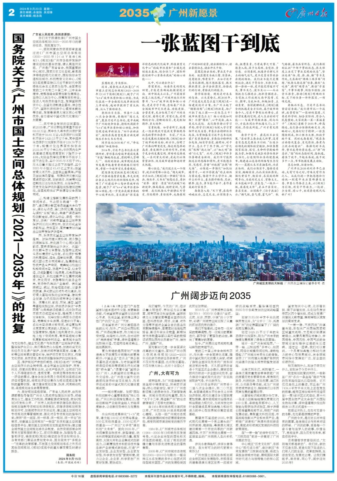在全市上下持续深入学习贯彻党的二十届三中全会及省委十三届五次全会精神的关键之时,在“二次创业”再出发,“大干十二年,再造新广州”的开局之年,《广州市国土空间总体规划(2021—2035年)》获国务院正式批复,立起了广州新一轮大发展的“四梁八柱”,为广州在进一步全面深化改革新征程上开好局、起好步注入强劲动力。