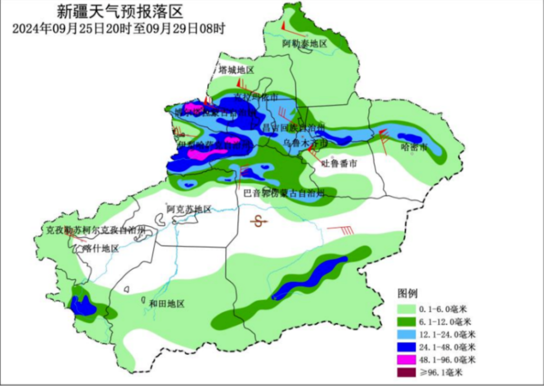 2024年9月25日20时至9月29日08时新疆天气预报图。图/新疆气象台提供