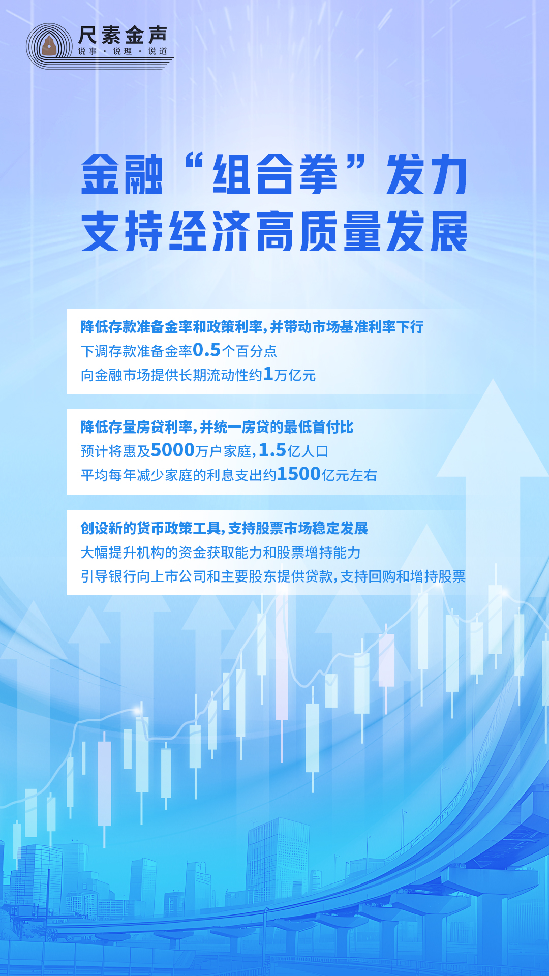 下调存款准备金率0.5个百分点,向金融市场提供长期流动性约1万亿元;引导商业银行将存量房贷利率降至新发放贷款利率的附近,预计平均降幅约0.5个百分点左右;大幅提升机构的资金获取能力和股票增持能力,引导银行向上市公司和主要股东提供贷款,支持回购和增持股票……细数这套金融政策“组合拳”,不难看出,中国人民银行正通过加大货币政策调控的强度,提高货币政策调控的精准性,为经济稳定增长和高质量发展创造良好的货币金融环境。