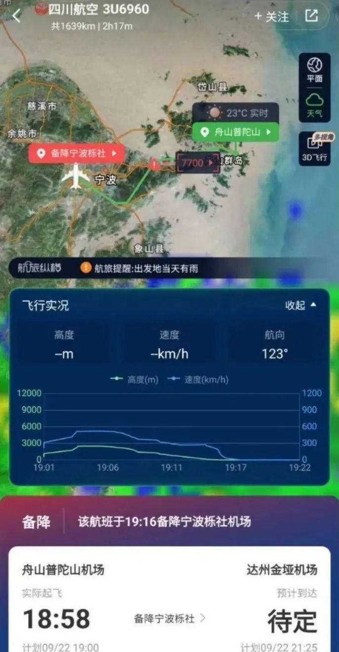 据四川航空官方微博9月23日消息,9月22日晚,3U6960舟山-达州-成都天府航班起飞后出现机械故障,机组出于安全考虑挂出7700代码,于19:16备降宁波,后更换飞机继续执行航班任务。该航班已于23日02:37、04:22先后将旅客安全送抵达州和成都。