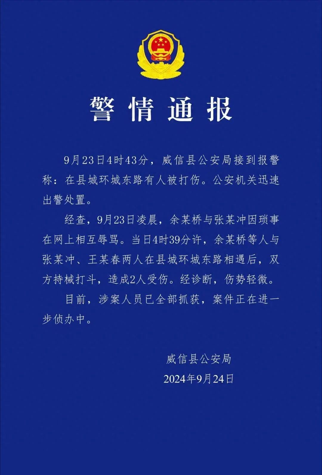 9月24日晚,威信警方发布警情通报:9月23日4时43分,威信县公安局接到报警称,在县城环城东路有人被打伤。公安机关迅速出警处置。经查,23日凌晨,余某桥与张某冲因琐事在网上相互辱骂。当日4时39分许,余某桥等人与张某冲、王某春两人在县城环城东路相遇后,双方持械打斗,造成2人受伤。经诊断,伤势轻微。
