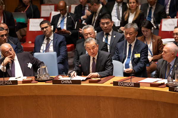 当地时间2024年9月24日,中共中央政治局委员、外交部长王毅在纽约联合国总部出席安理会乌克兰问题高级别会议。
