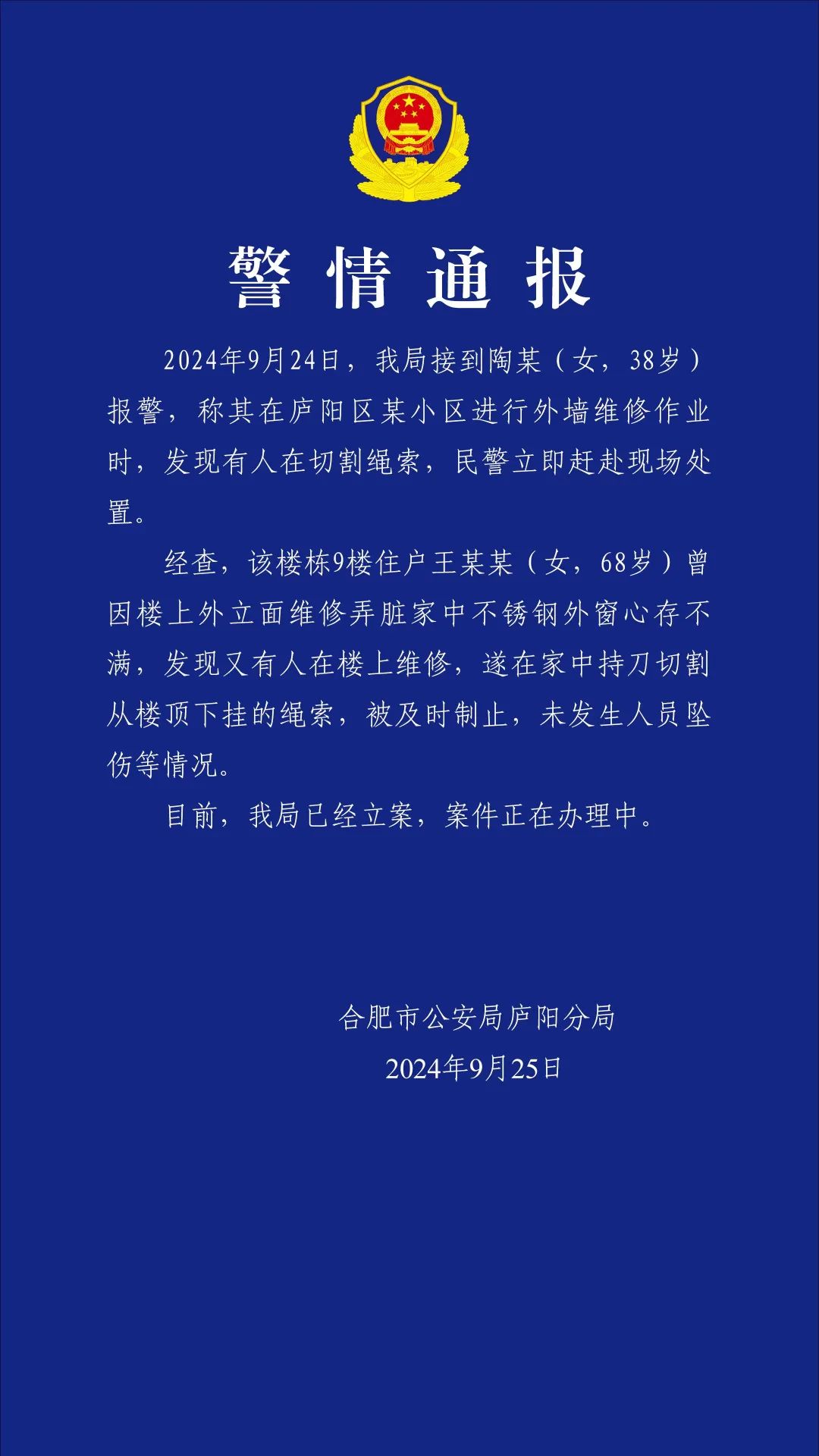 女子报警称其进行外墙维修作业时发现有人在切割绳索,合肥警方通报