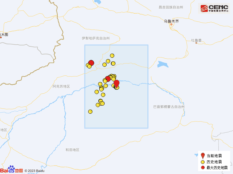 历史地震:根据中国地震台网速报目录,震中周边200公里内近5年来发生3级以上地震共383次,最大地震分别是2024年4月10日在新疆阿克苏地区拜城县发生的5.6级地震(距离本次震中180公里)和2020年1月16日在新疆阿克苏地区库车县发生的5.6级地震(距离本次震中58公里),按震级大小前50次历史地震分布如图。