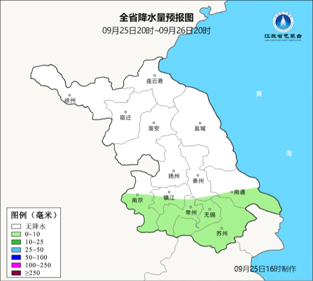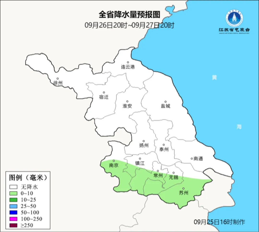 9月25日20时至9月26日20时: 苏南地区多云有时阴有分散性阵雨,其他地区晴到多云。最高温度本省东部地区26℃左右,其他地区27~28℃;最低温度淮北地区17~18℃,沿江和苏南地区22℃左右,其他地区19~20℃。全省偏北风4-5级。