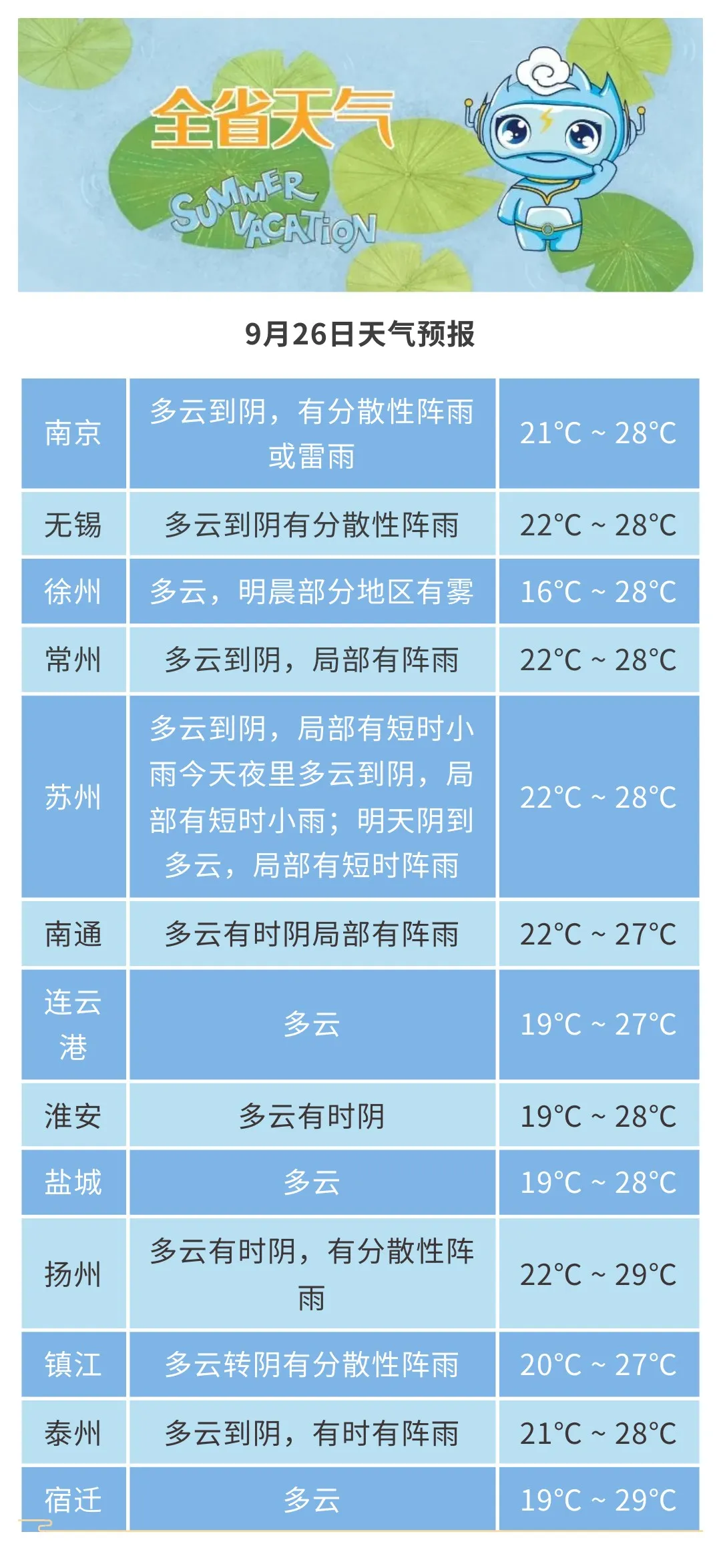 9月26日20时至9月27日20时: 苏南地区多云有时阴有阵雨并渐止转多云,其他地区晴到多云。最高温度本省东部地区26℃左右,其他地区28~29℃;最低温度淮北地区18℃左右,沿江和苏南地区21~22℃,其他地区19~20℃。全省偏东风3-4级。