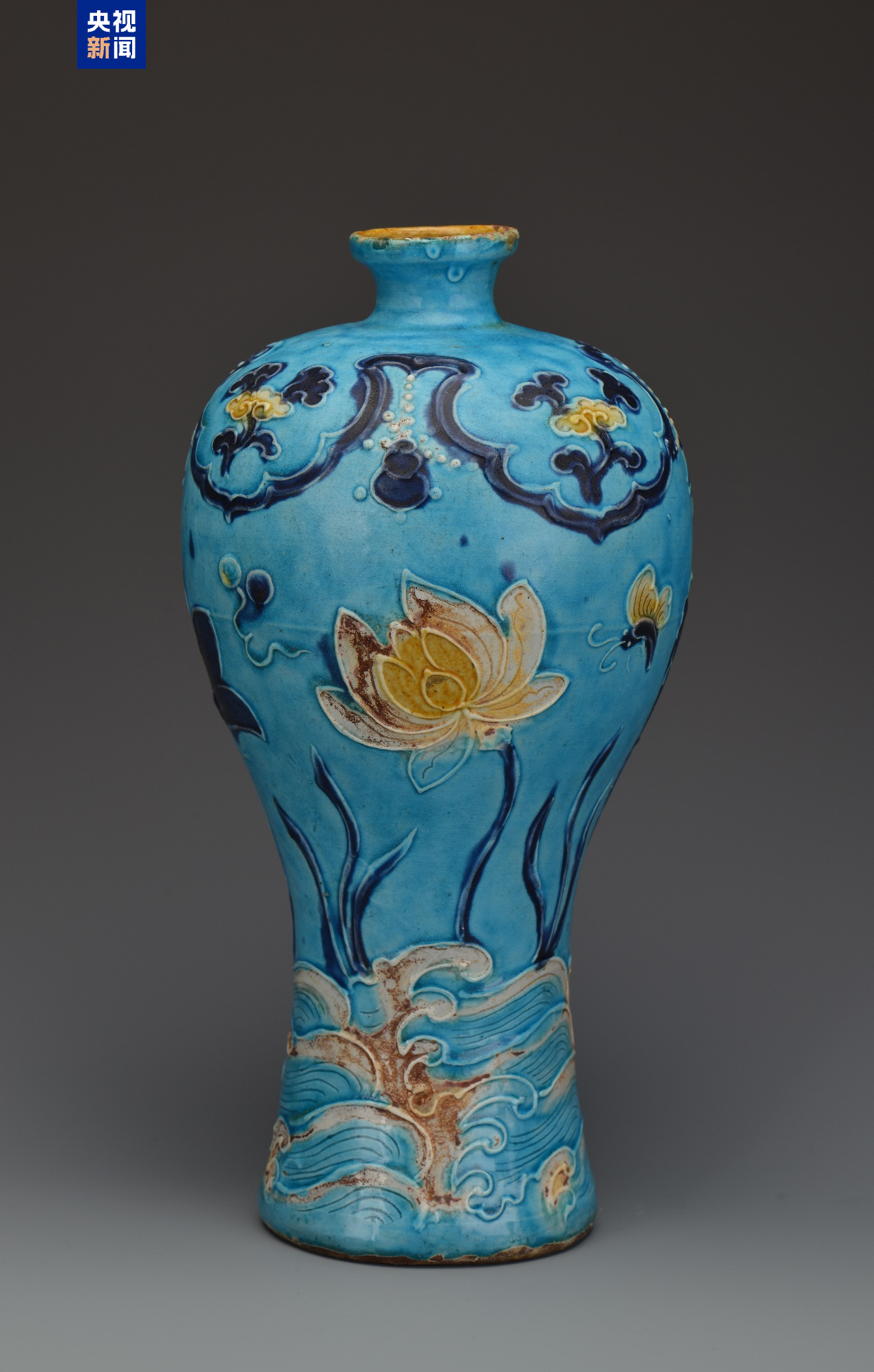 △上图为:明珐华彩孔雀蓝釉莲池纹梅瓶