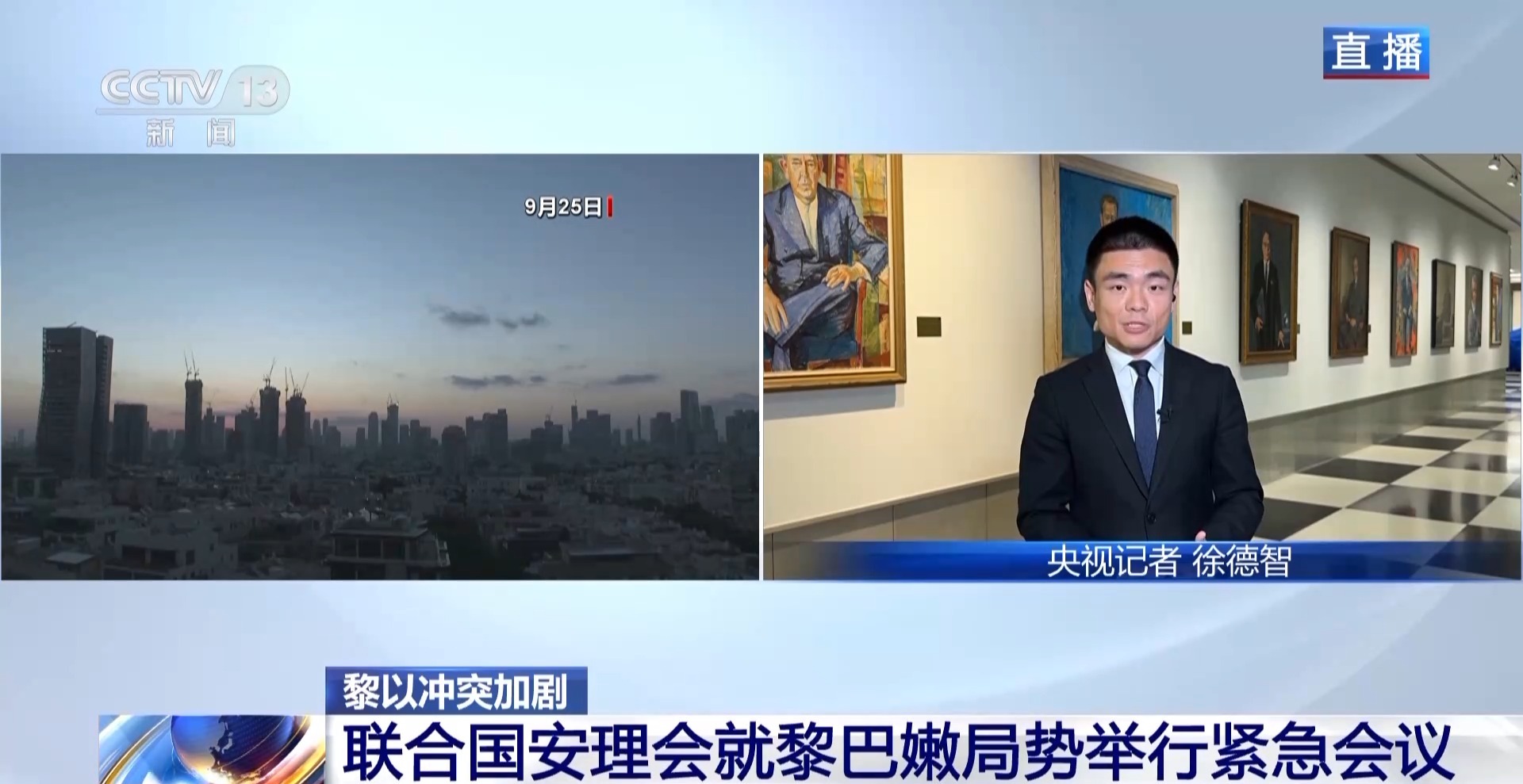 央视记者 徐德智:现在是纽约时间25日21时许,此次安理会的紧急会议刚结束。联合国秘书长古特雷斯在会议上表示,他对于局势的升级表示震惊。从去年10月7日开始,黎以边境几乎每天都有交火,导致黎巴嫩20万居民和以色列北部6万居民被迫逃离家园。古特雷斯还表示,自从上周黎巴嫩通信设备爆炸事件后局势正在急剧恶化,他呼吁黎以双方立刻停火止战。