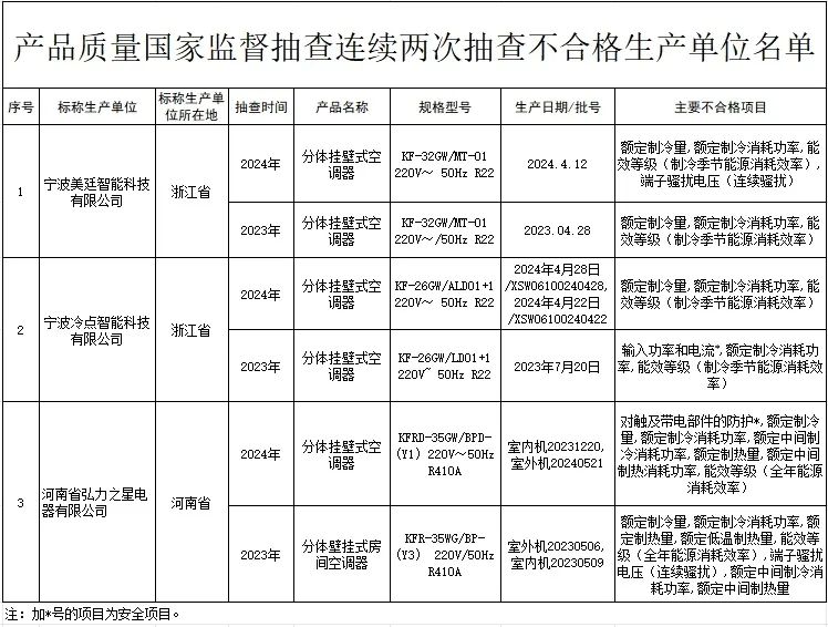 市场监管总局近期组织家用燃气快速热水器等7种产品质量国家监督抽查。共抽查检验488家生产单位、272家销售单位的489批次产品,发现不合格产品35批次 。在不合格产品中,家用燃气快速热水器8批次、瓶装液化石油气调压器12批次、房间空气调节器8批次、汽车用制动器衬片6批次、室外健身器材1批次。跟踪抽查到上次抽查不合格生产单位10家,其中有3家生产单位产品仍不合格。