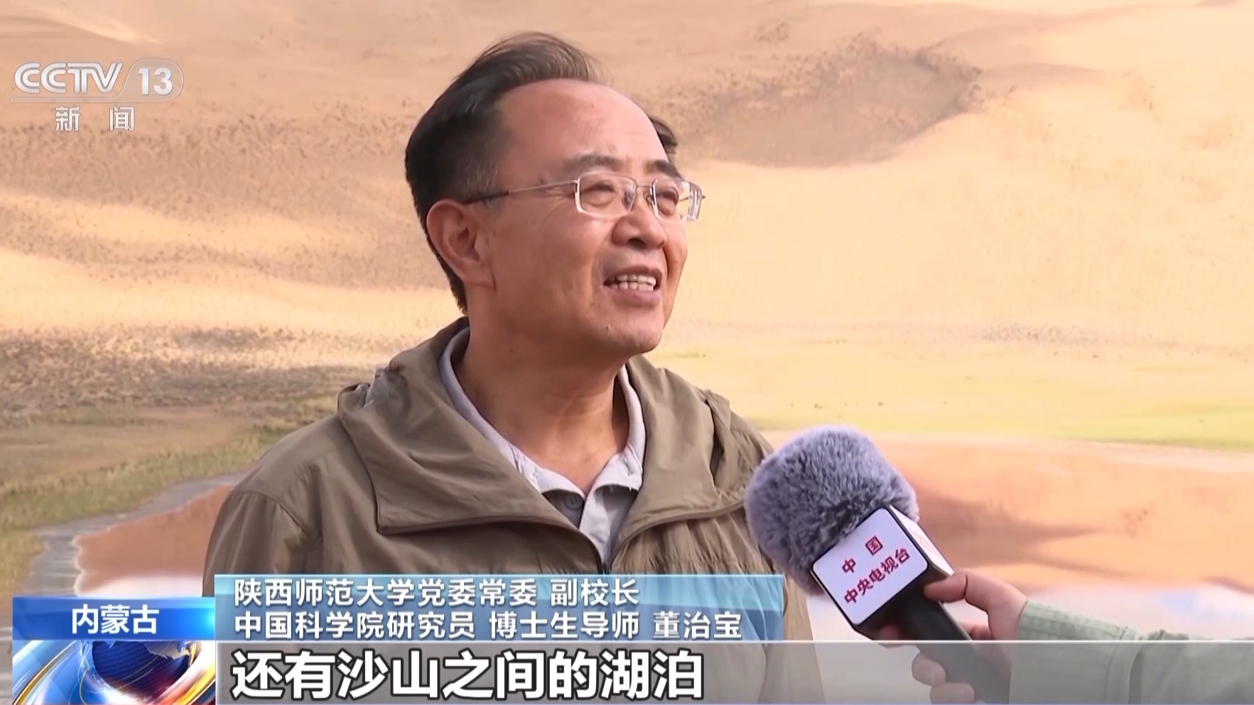 陕西师范大学党委常委、副校长,中国科学院研究员、博士生导师 董治宝:巴丹吉林的沙漠,首先是高大沙山,还有沙山之间的湖泊,再就是湖泊的这些颜色变化更增加了湖泊的美感,也给巴丹吉林沙漠申遗加分。