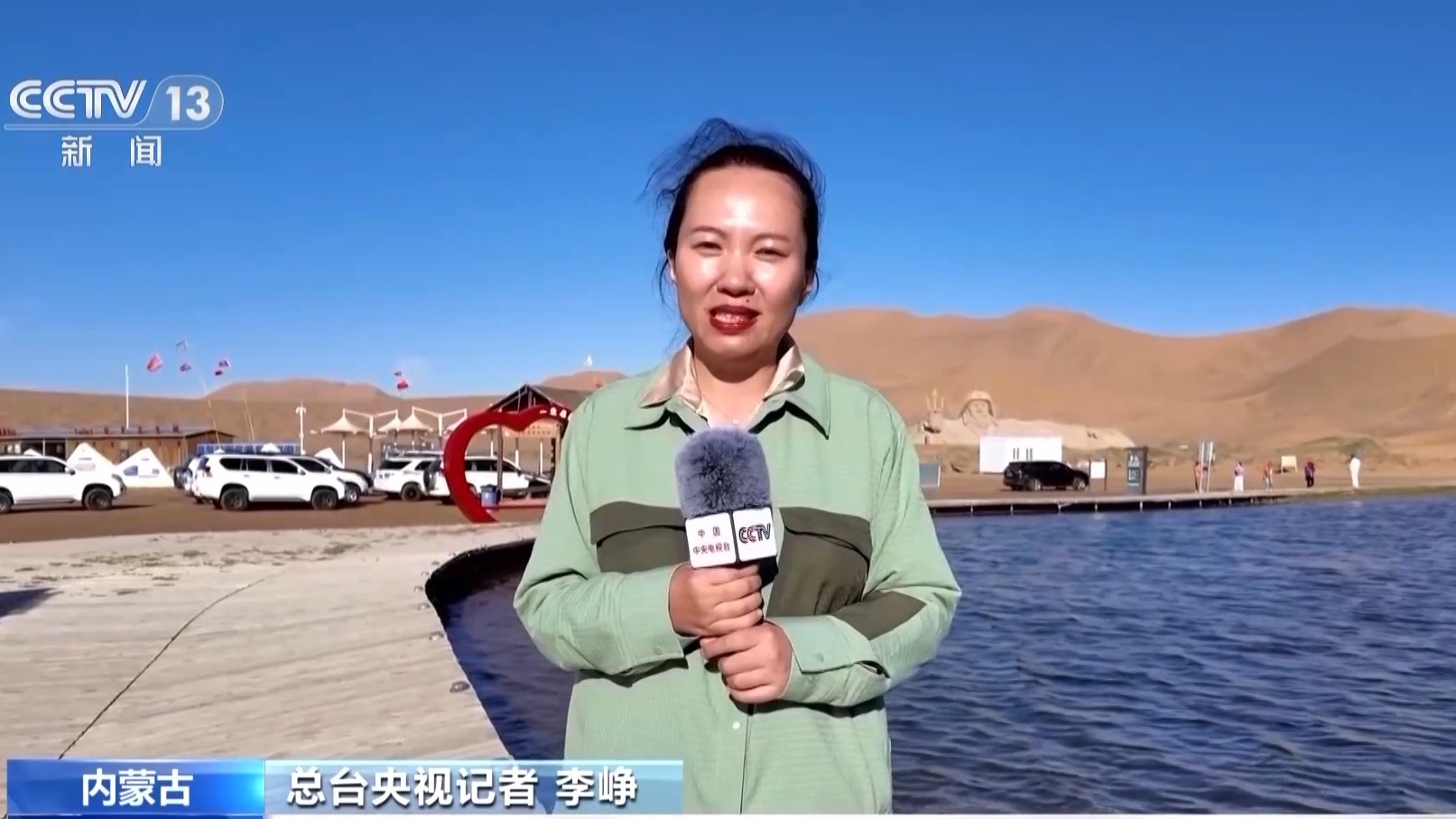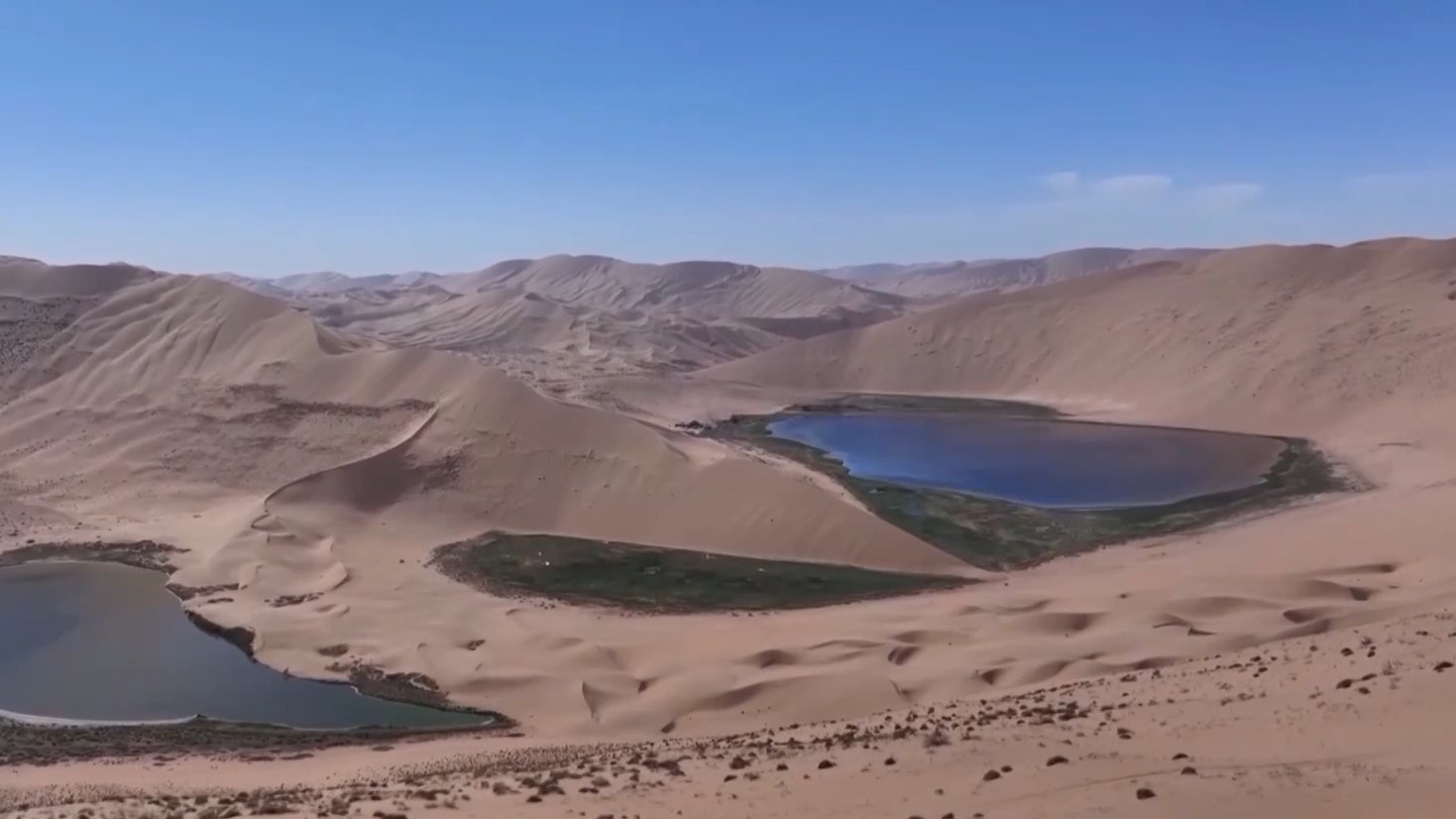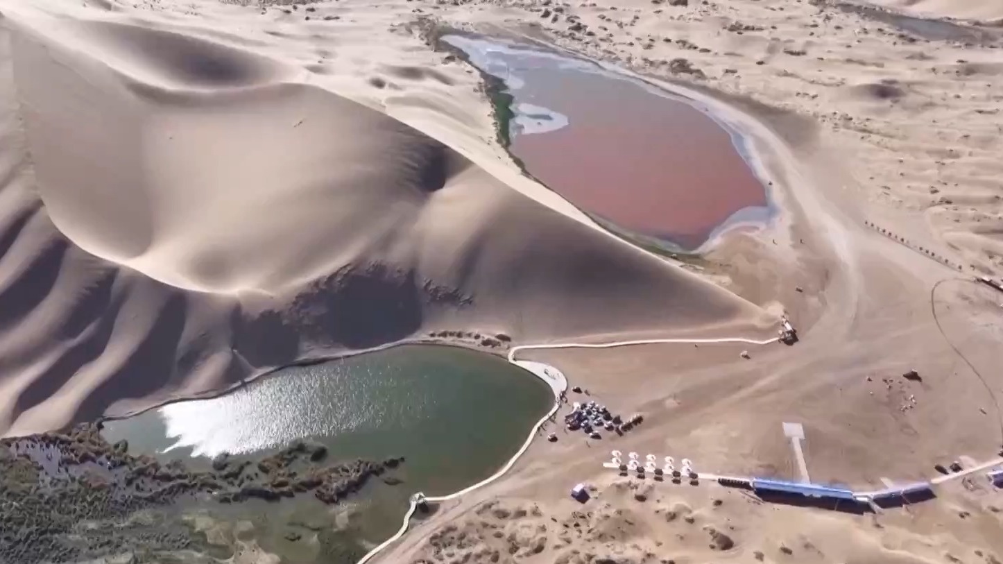 总台央视记者 李峥:在巴丹吉林沙漠中驰骋了两天,我已无数次被深深震撼和感动,并刷新了对沙漠的认知。在巴丹吉林将近5万平方公里的沙漠中,既有高大沙山,最高海拔达1600多米,相对高度400多米,堪称“沙山珠峰”。广袤沙漠中又有144个清澈的湖泊镶嵌其中,有咸水湖也有淡水湖。相信未来巴丹吉林必将成为内蒙古乃至中国的又一张全新名片。