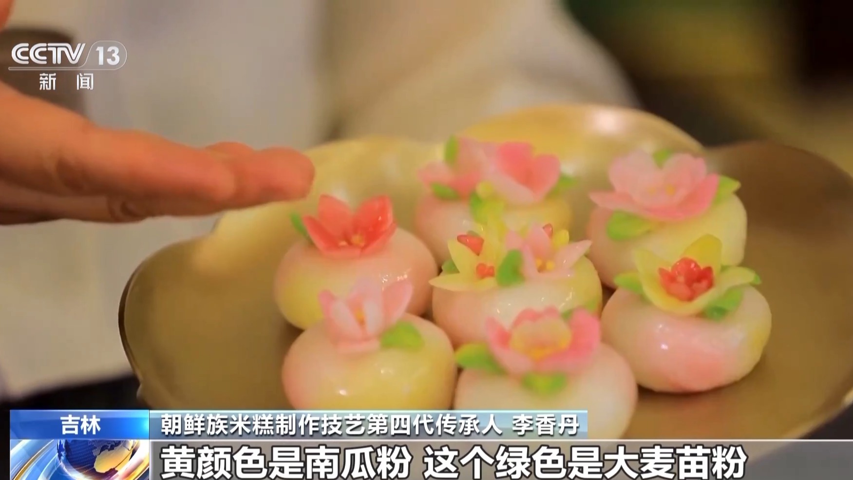 朝鲜族米糕制作技艺第四代传承人 李香丹:黄颜色是南瓜粉,绿色是大麦苗粉,这花米糕是我在国际料理大赛获得了三次金牌的产品。