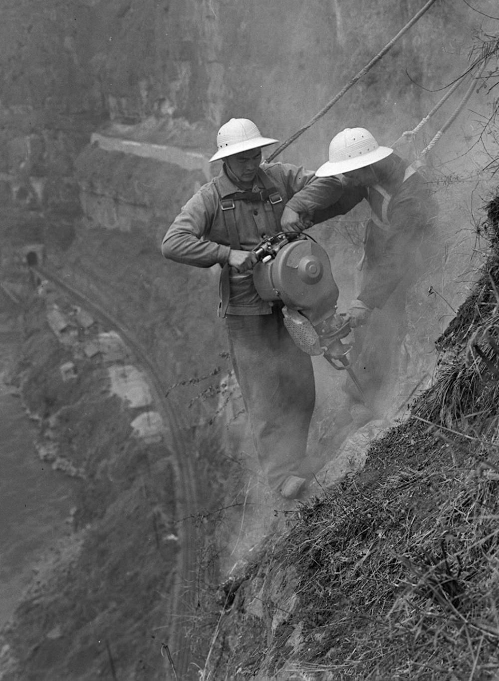 川藏公路筑路战士在怒江两岸的悬崖陡壁上开山修路。川藏公路1950年开始修建。新华社发(李万春、张加里摄)