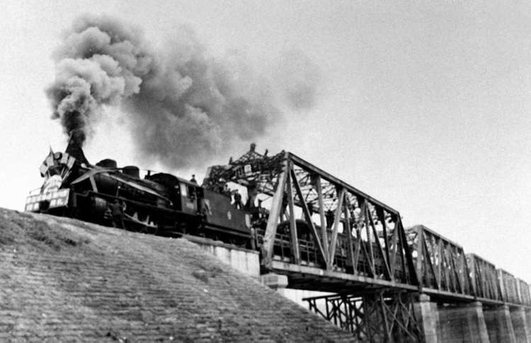 1951年12月,成渝铁路沱江大桥建成通车后,第一列火车通过大桥。新华社发