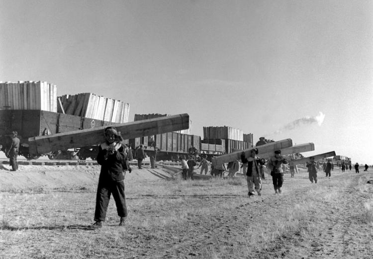 在内蒙古集二线铁路建设中,工人扛着枕木,前往铺轨地点。集二线铁路1953年5月开工建设。新华社记者 邹健东 摄