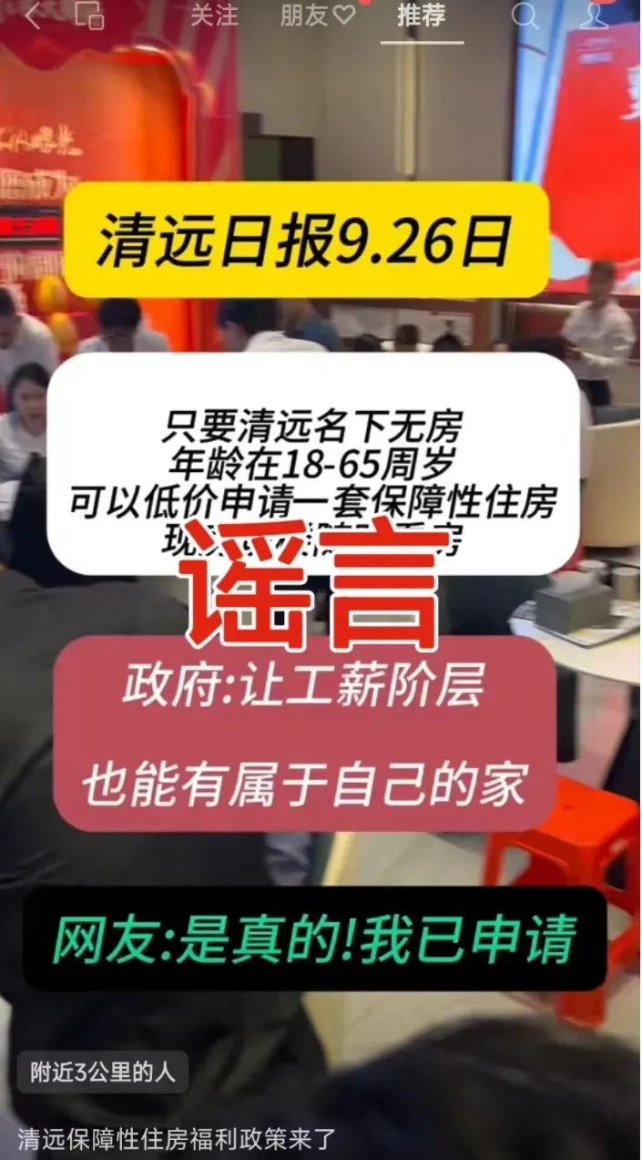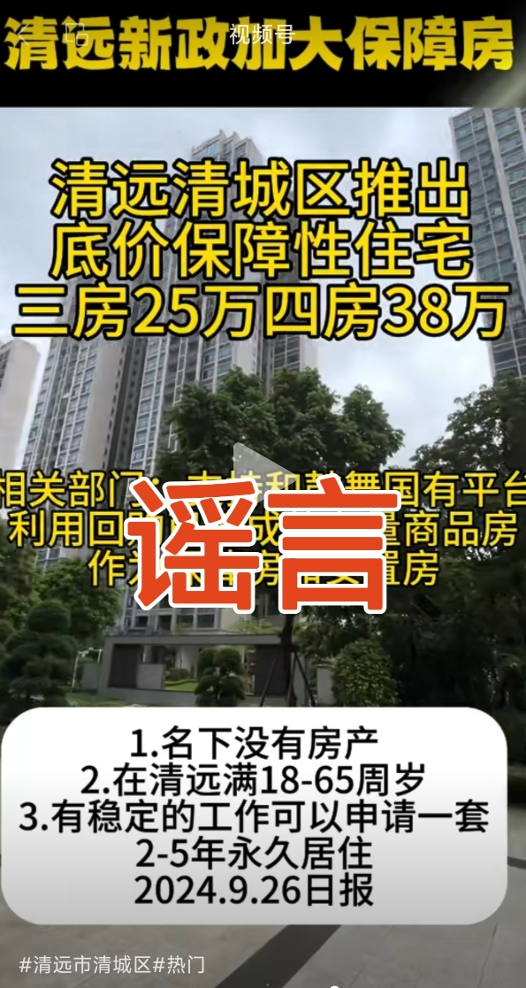 近日,广东清远一些视频号发布了“清远新政加大保障房”的信息,表示“只要在清远名下无房,年龄在18-65周岁可以低价申请一套保障性住房,并随时可以看房”。