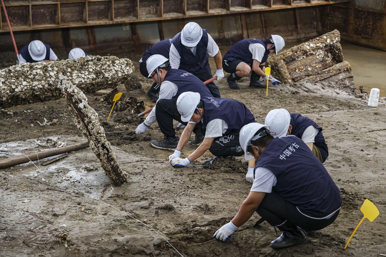 经国家文物局批准,长江口二号古船考古试掘工作计划于2024年9月至2025年1月期间实施,发掘区位于古船南端,布设4个探方,面积约为124平方米,深度约3米。考古试掘遵循从上至下、由晚至早的原则,以探方、船舱为基本工作单位,船体内外同时向下发掘。
