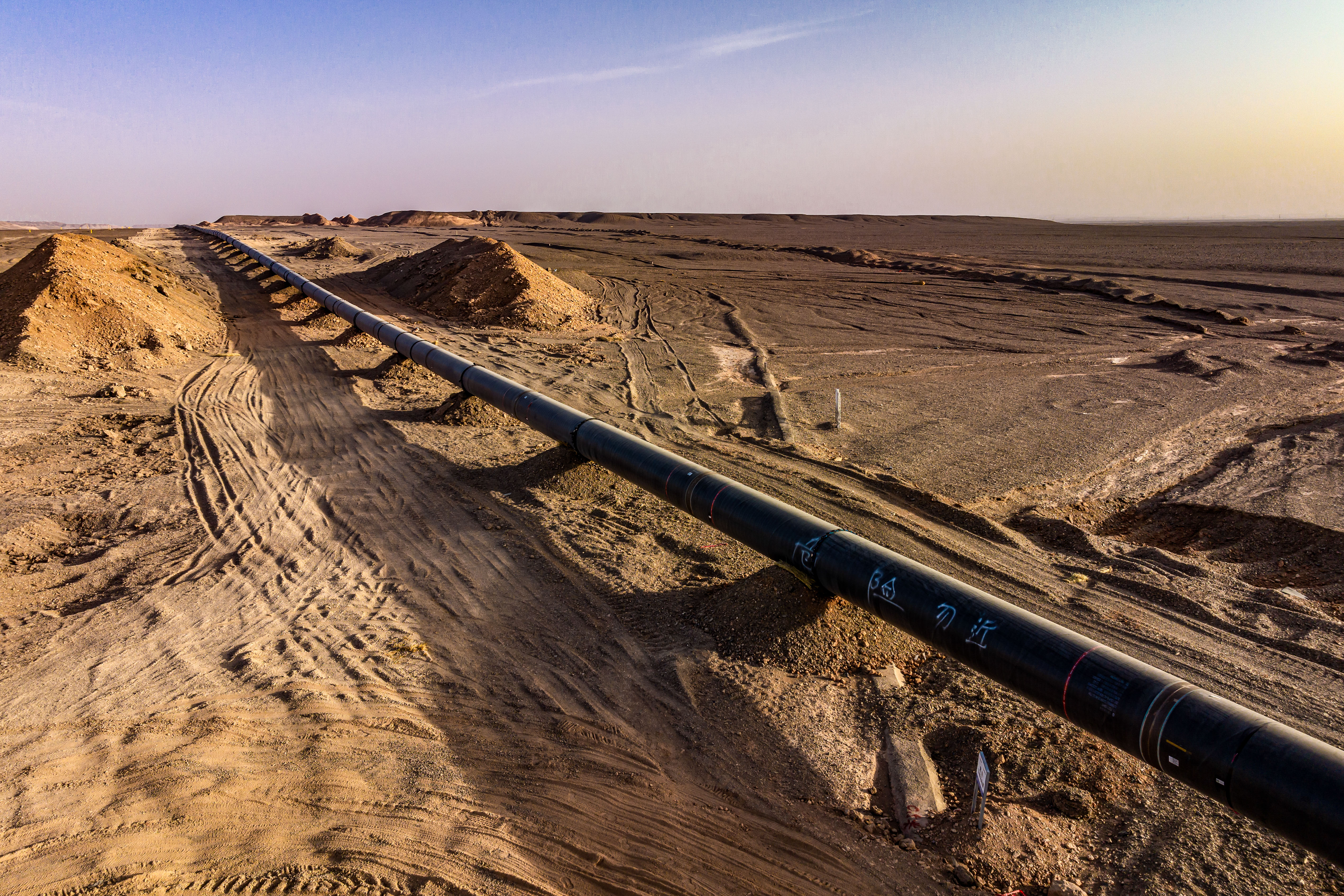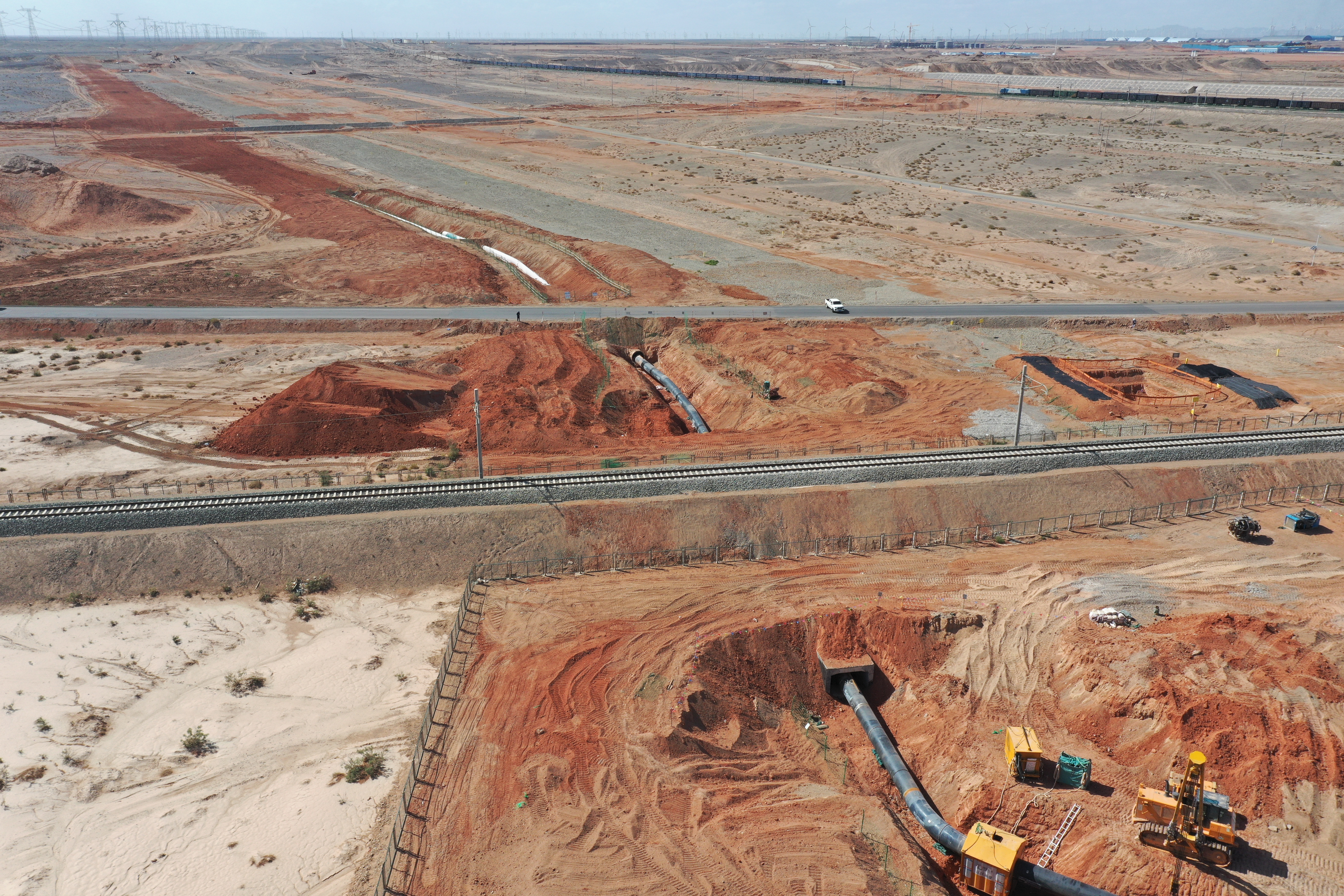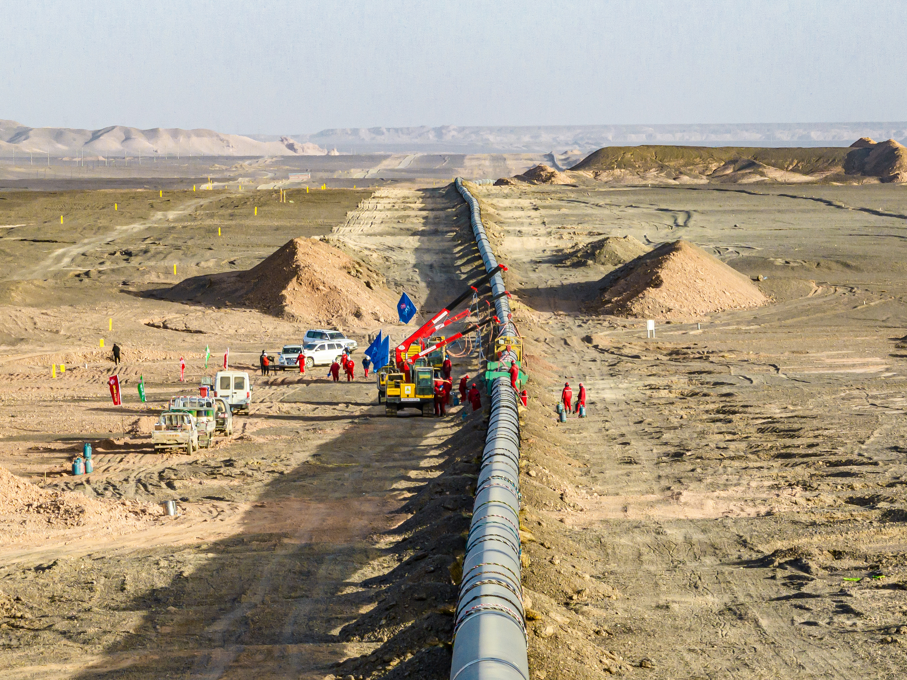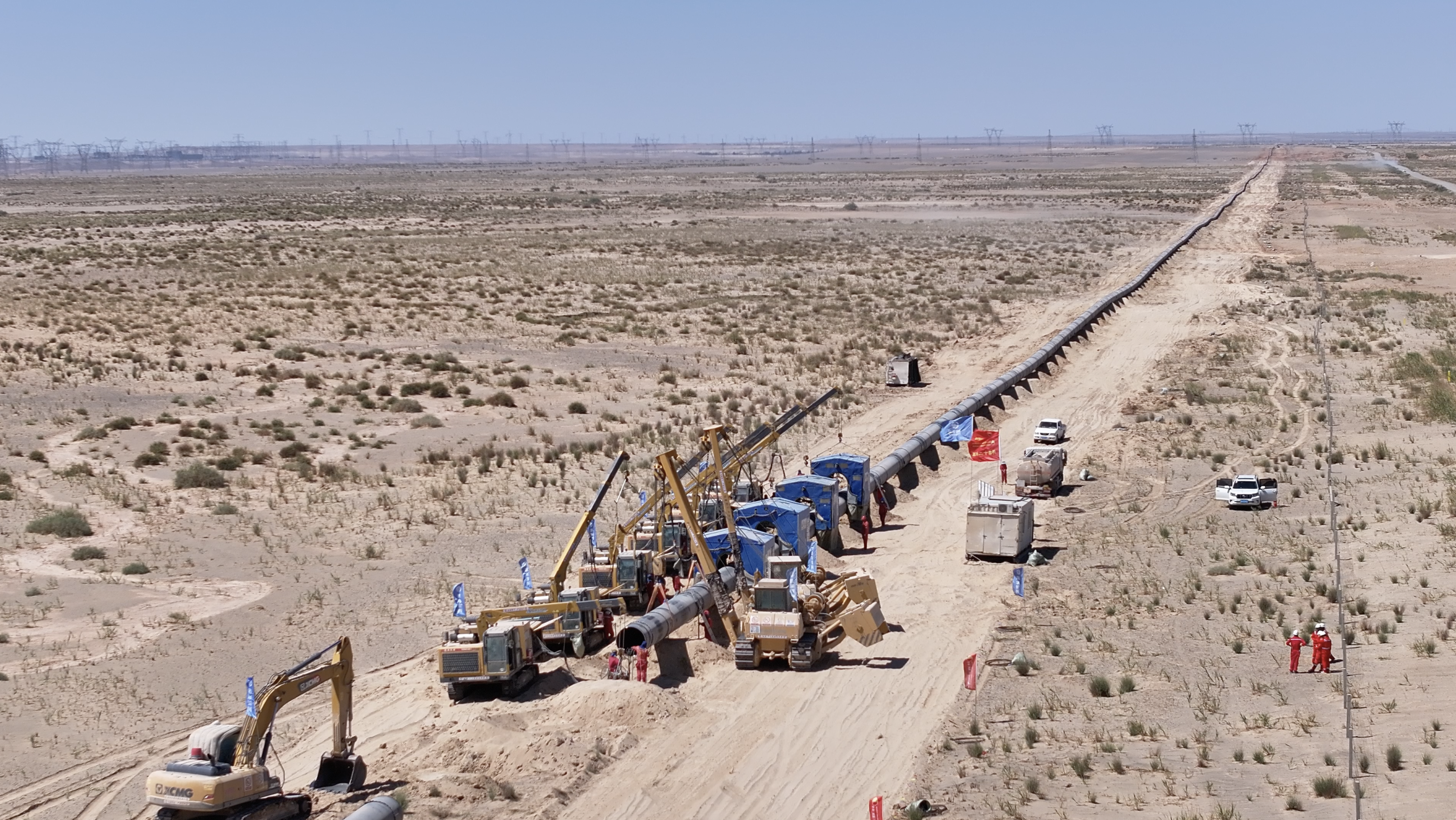 其中,新疆段管道长度583公里,起自新疆吐鲁番压气站,沿线以戈壁、荒漠为主,人烟稀少,交通不便。管道穿越火焰山下的吐鲁番市高昌区和鄯善县,夏季温度最高达47.8摄氏度;途经“百里风区”,一年中8级以上大风天气近140天,局部地段阵风超过12级。